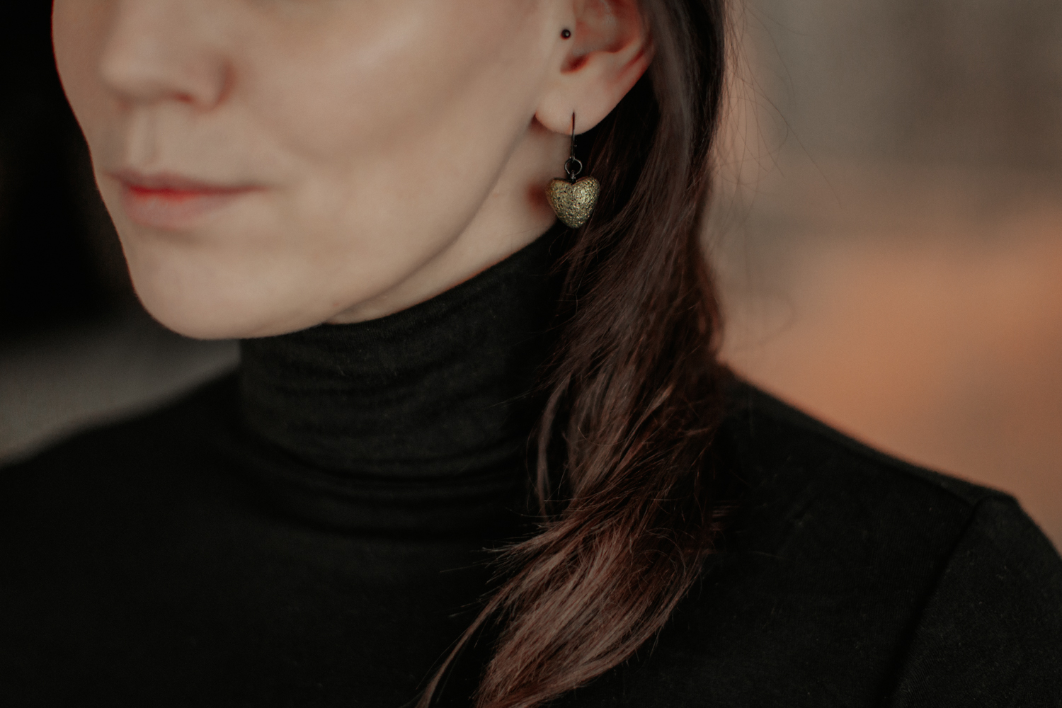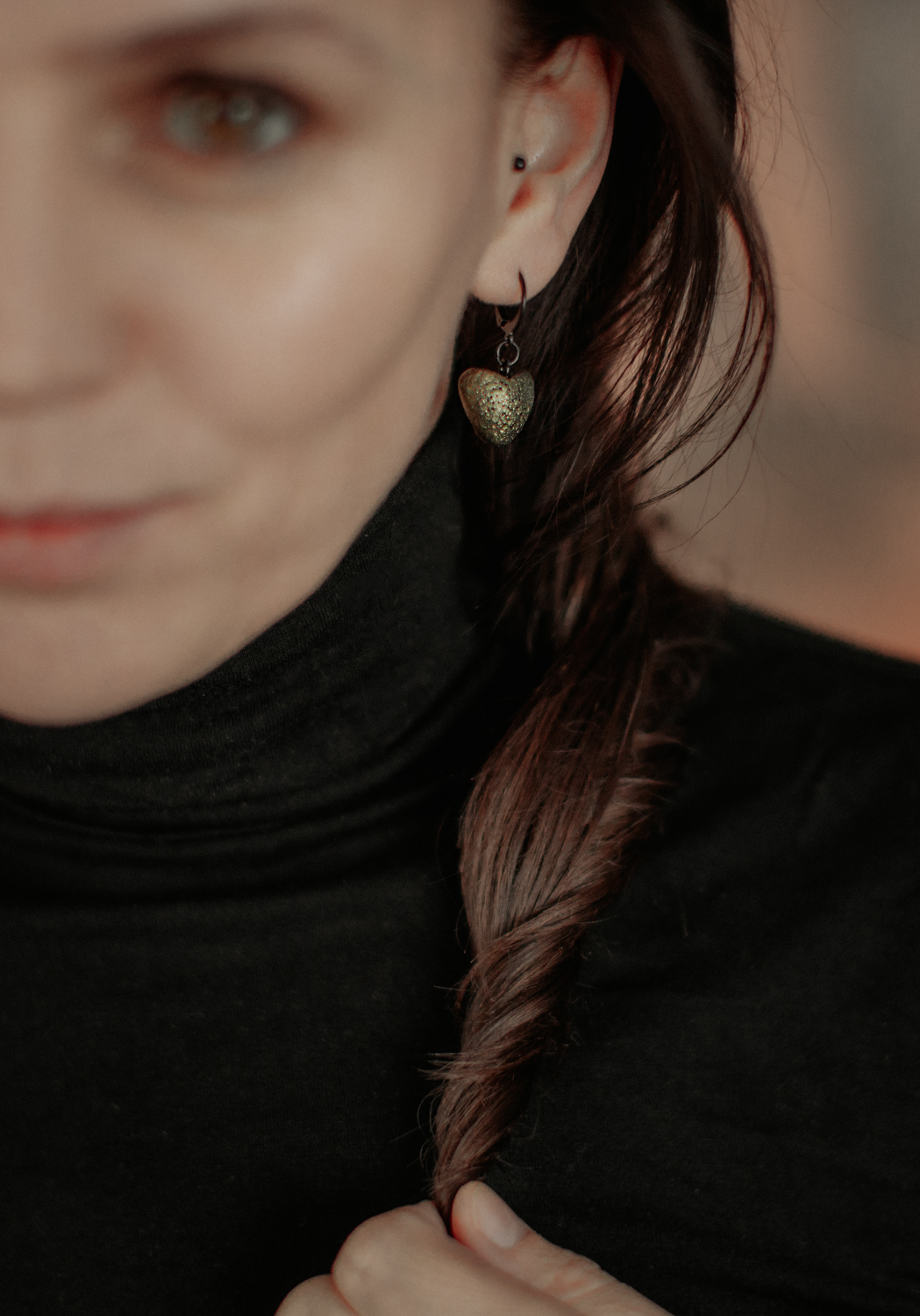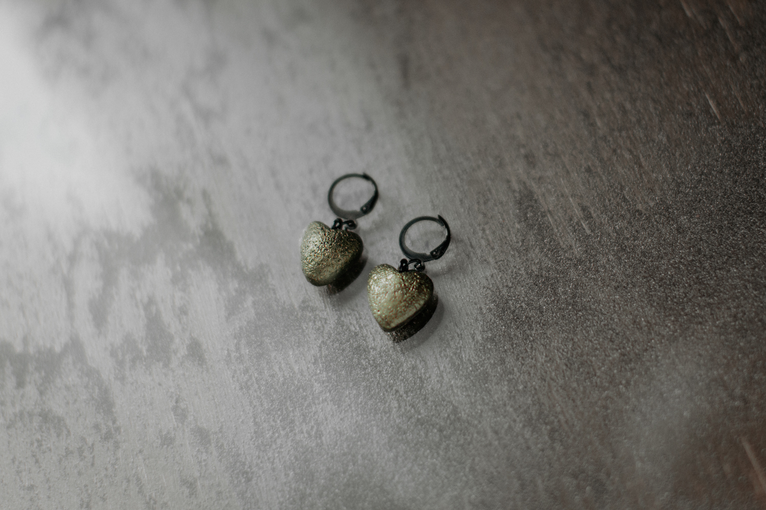 Āķu auskari “Zaļās meža sirsniņas”, veidoti no kvalitatīva polimērmāla, apgleznoti ar mirdzošu akrila krāsu, kas piešķir tiem izsmalcinātu un modernu raksturu, savukārt vieglais materiāls nodrošina ērtu nēsāšanu visas dienas garumā. Auskariem ir metāla āķi. Katrs pāris tiek rūpīgi izstrādāts ar rokām, padarot katrus auskarus mazliet unikālus. Tie ir pietiekami neuzkrītoši ikdienai, bet tajā pašā laikā stilīgi arī īpašiem notikumiem.