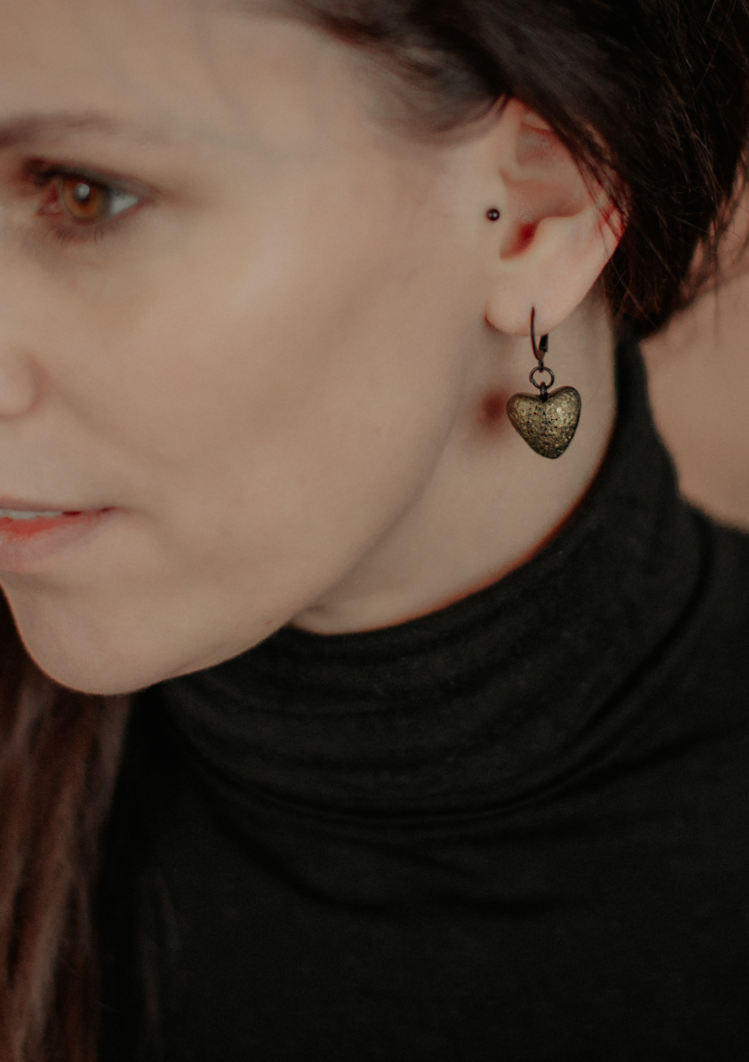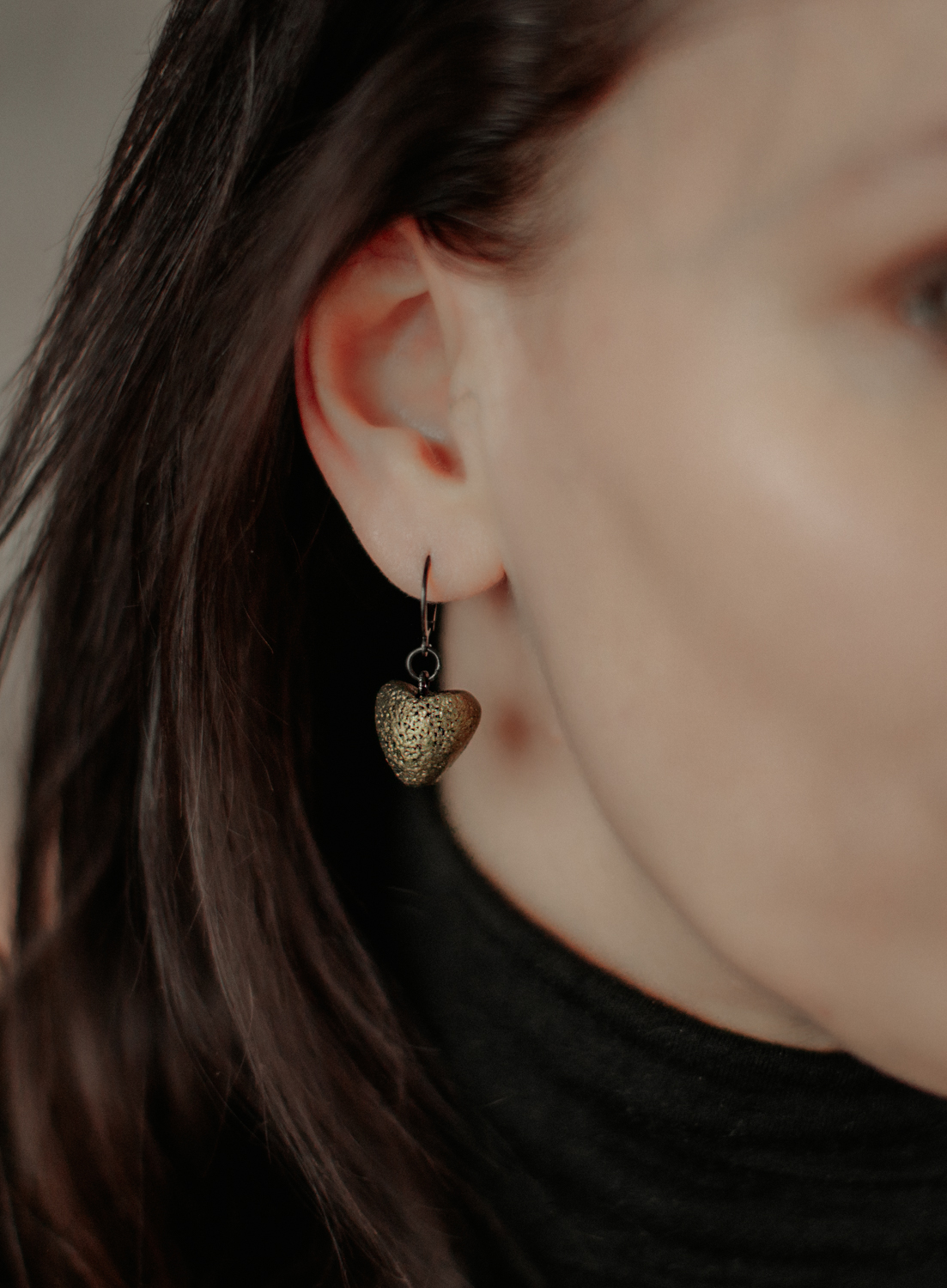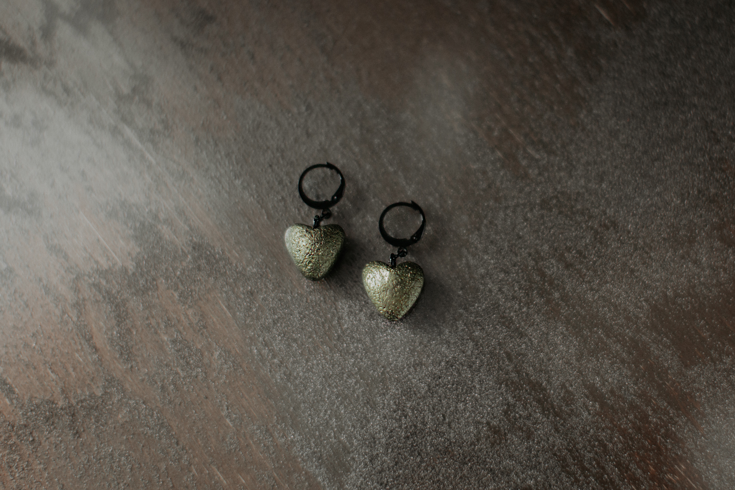 Āķu auskari “Zaļās meža sirsniņas”, veidoti no kvalitatīva polimērmāla, apgleznoti ar mirdzošu akrila krāsu, kas piešķir tiem izsmalcinātu un modernu raksturu, savukārt vieglais materiāls nodrošina ērtu nēsāšanu visas dienas garumā. Auskariem ir metāla āķi. Katrs pāris tiek rūpīgi izstrādāts ar rokām, padarot katrus auskarus mazliet unikālus. Tie ir pietiekami neuzkrītoši ikdienai, bet tajā pašā laikā stilīgi arī īpašiem notikumiem.