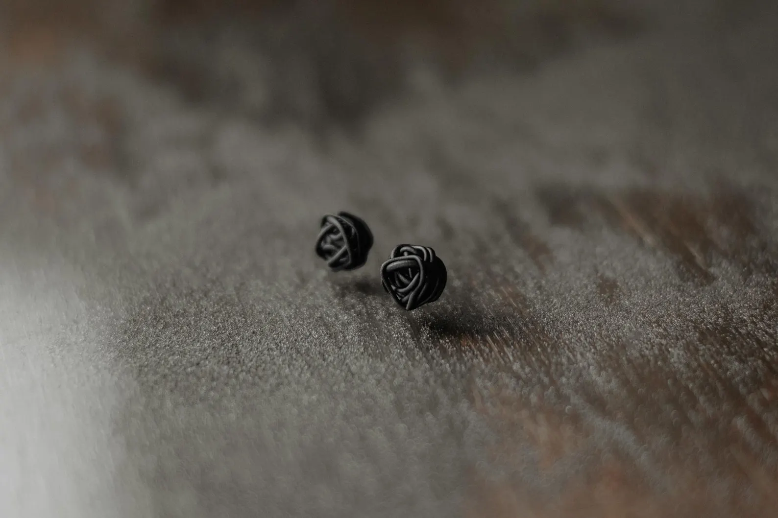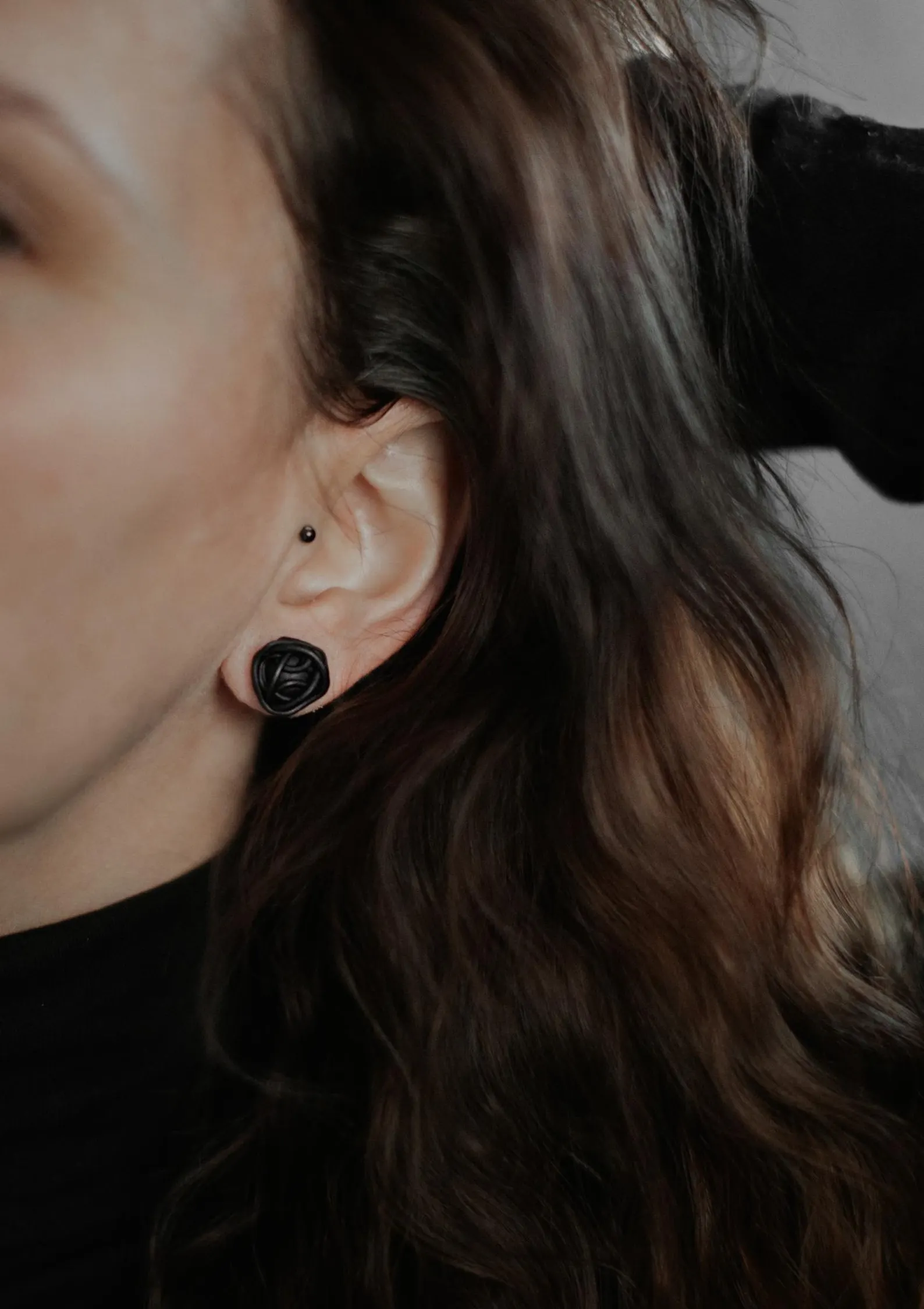 Auskari ar sudraba nagliņu, veidoti no kvalitatīva polimērmāla. Krāsa – matēta melna, kas piešķir rotai modernu un elegantu izskatu. Katra rota ir unikāls roku darbs, kas padara katru pāri neatkārtojamu.