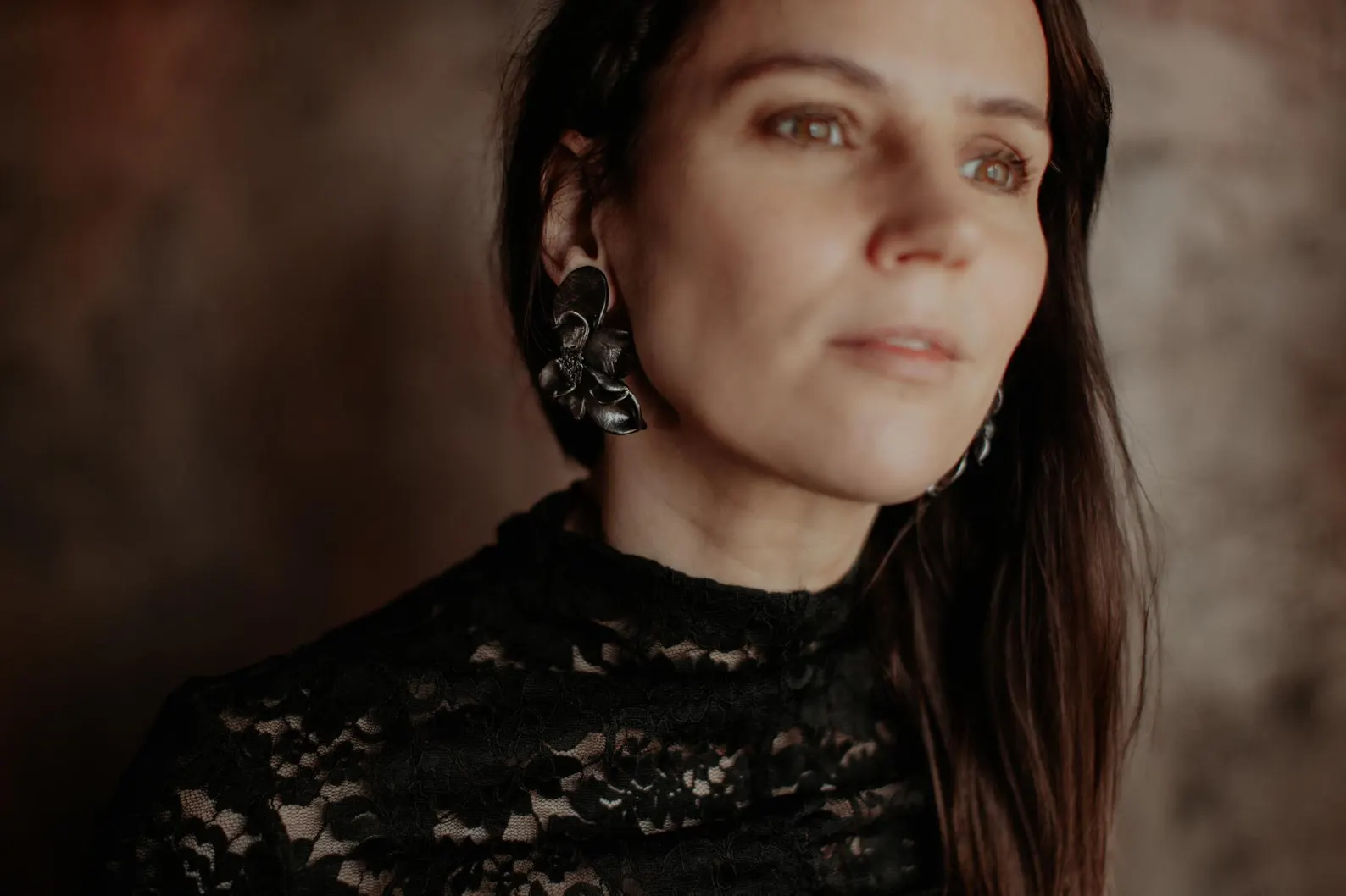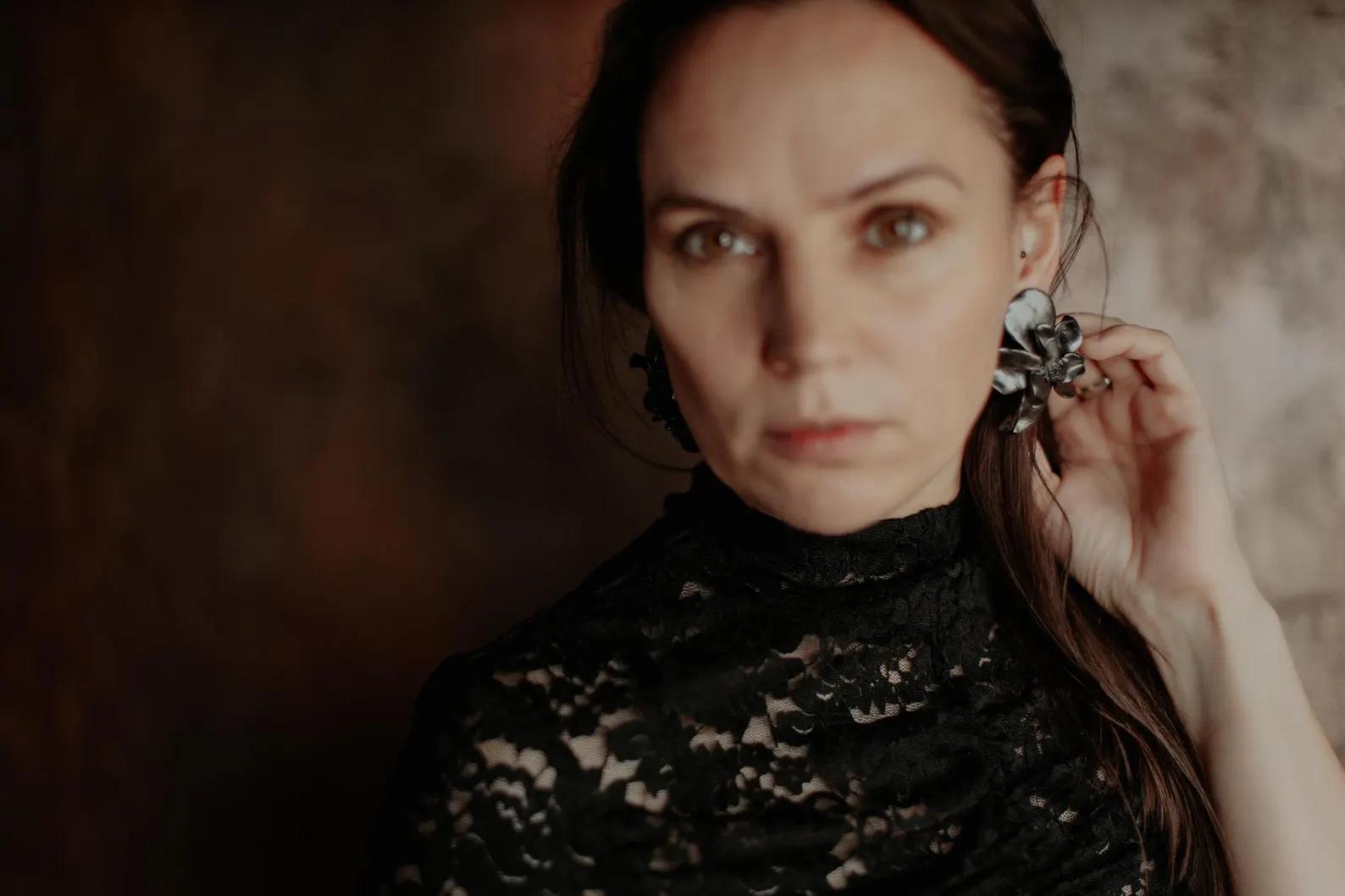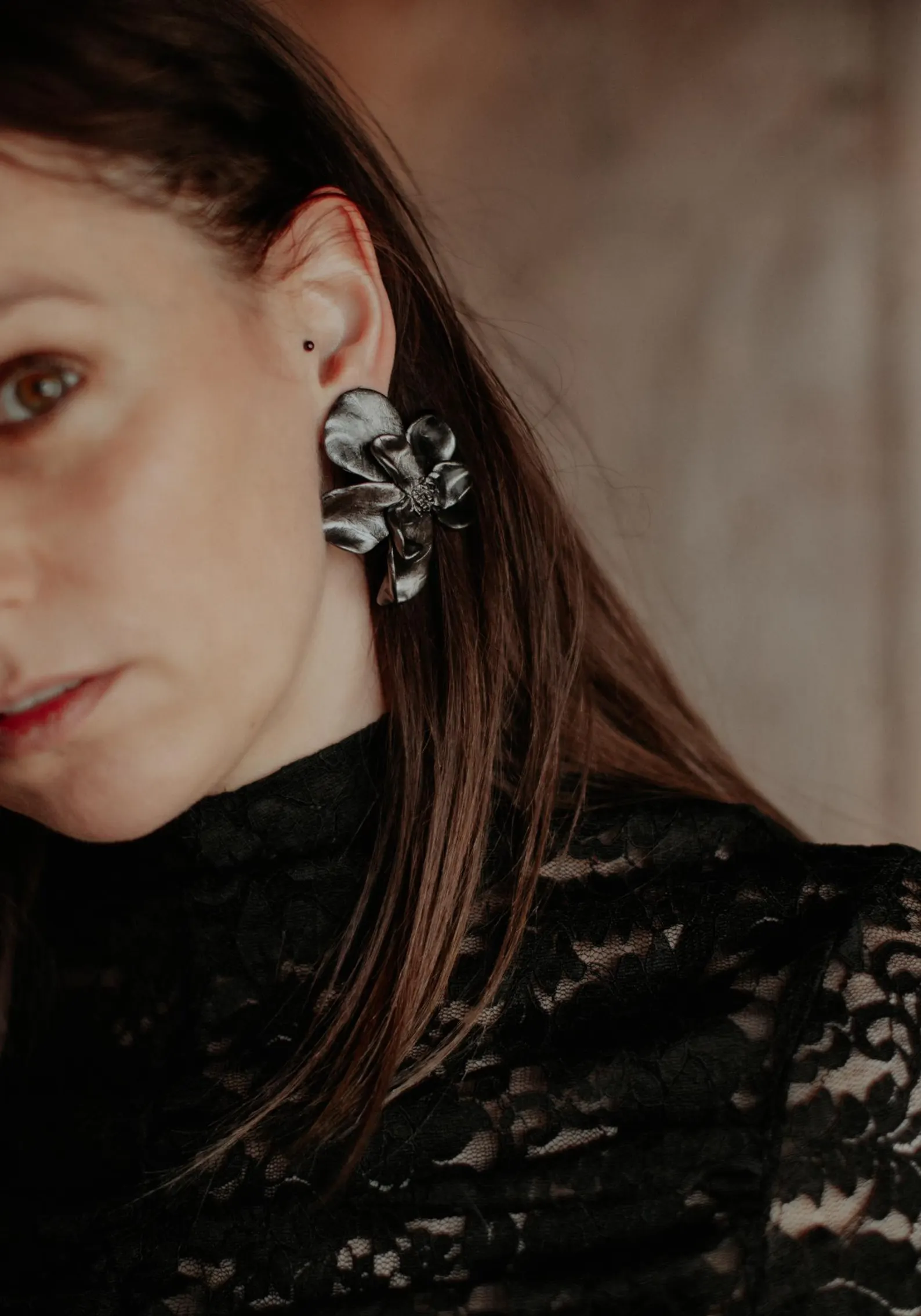 Auskari ar sudraba nagliņu, veidoti no kvalitatīva polimērmāla, apgleznoti ar mirdzošu akrila krāsu. Auskariem ir mirdzošs pelēks/melns tonis, kas mainās dažādos apgaismojumos, piešķirot īpašu šarmu un unikalitāti. Katrs pāris ir roku darbs. Šis aksesuārs ir lieliski piemērots gan ikdienai, gan svinīgiem notikumiem, piešķirot tēlam smalku eleganci. Pieejami arī klipši.