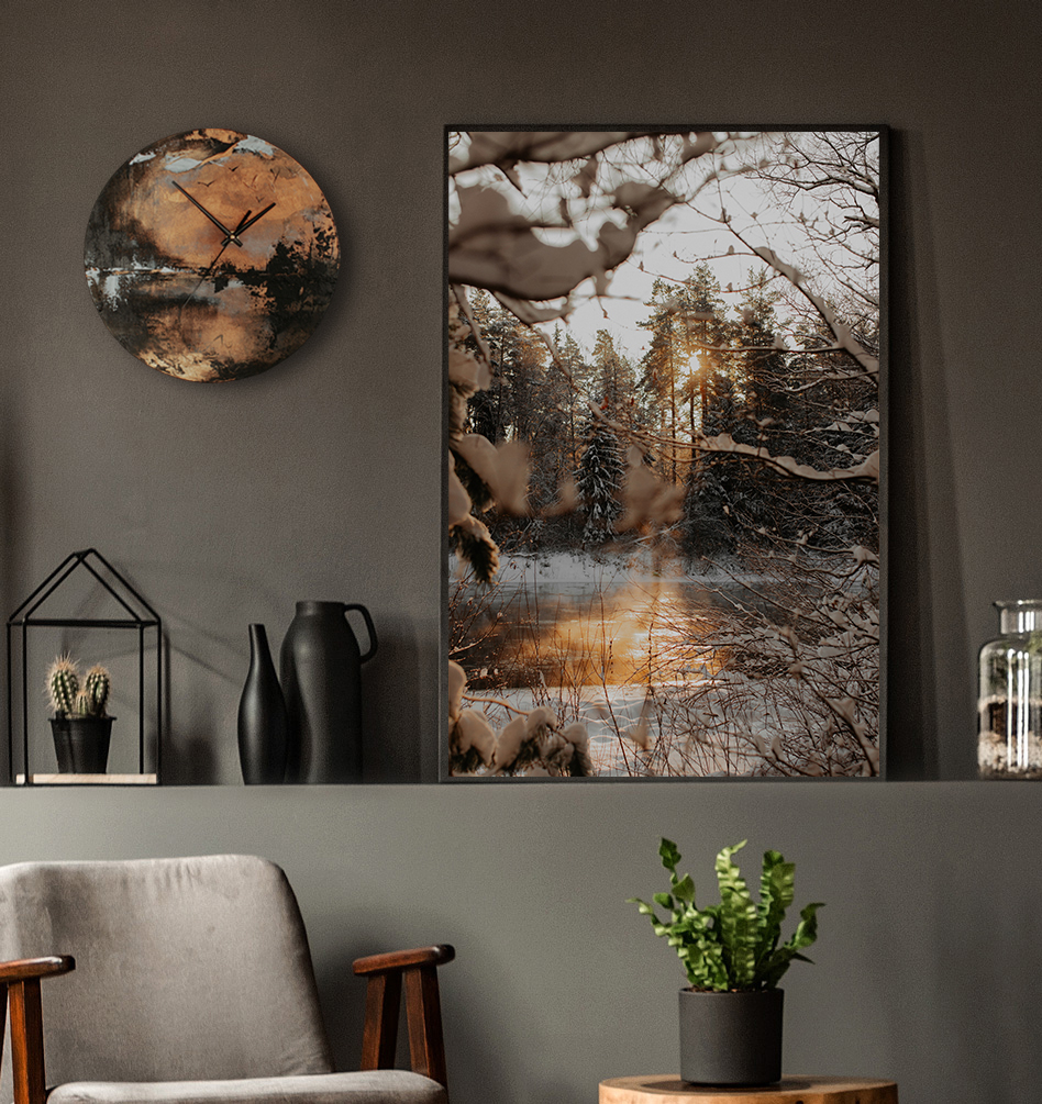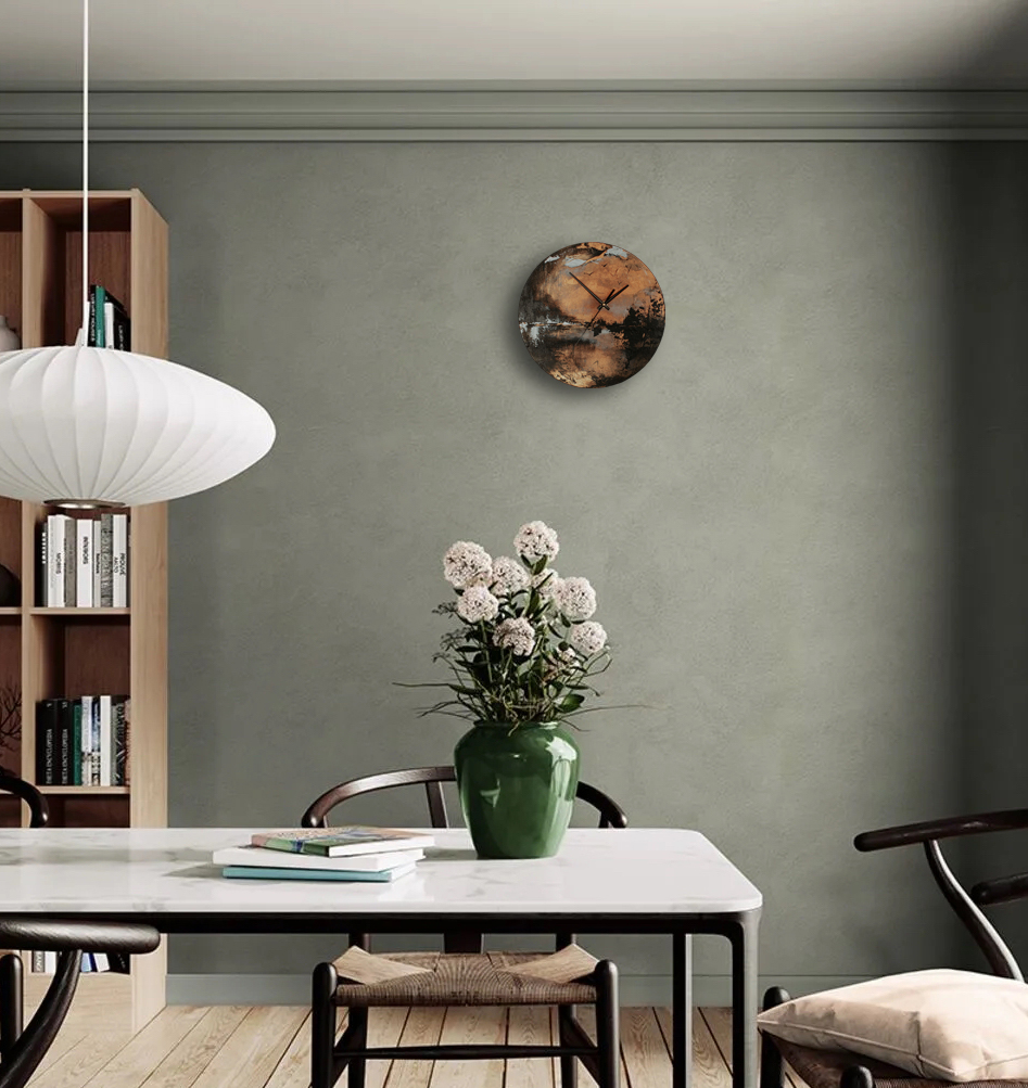 Dizaina pulkstenis “Ezers” ir oriģināls interjera mākslas darbs – vairāk nekā dekors, tas ir noskaņas radītājs telpā. Unikāls, ar rokām radīts dizaina sienas pulkstenis, kas apvieno funkcionalitāti ar mākslu. Uz pulksteņa virsmas veidots īpašs gleznojums dabas iedvesmotā stilā – ar ezeru, meža atspulgiem tajā, lidojošiem putniem, kas rada mierpilnu un nedaudz noslēpumainu noskaņu.
