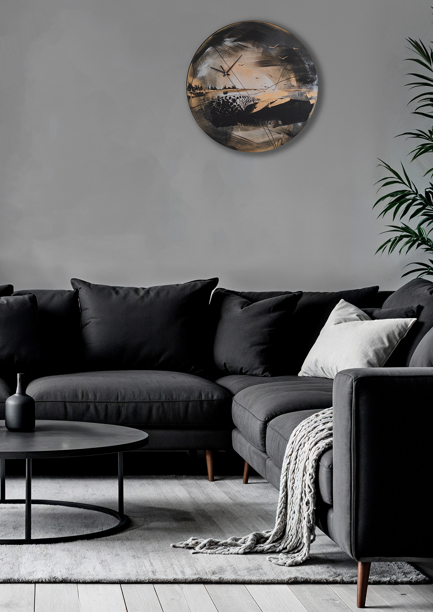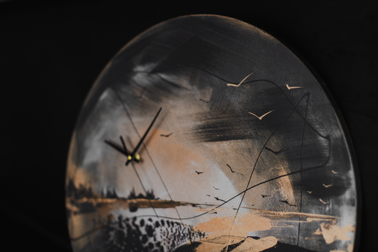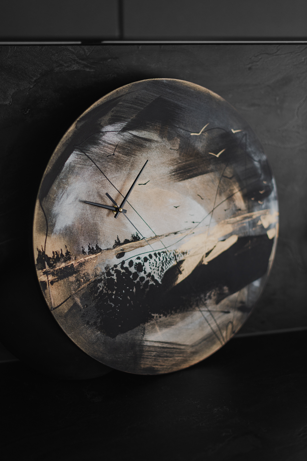 Dizaina pulkstenis “Tālumā” ir oriģināls interjera mākslas darbs – vairāk nekā dekors, tas ir noskaņas radītājs telpā. Modernisma stilā veidotā kompozīcija ar smalku mirdzumu piešķir virsmai dziļumu un dzīvīgumu. Mainoties apgaismojumam, darbs atklājas no jauna – brīžiem noslēpumains un klusināts, brīžiem maigi starojošs un gaismas piepildīts. Akcents, kas ienes telpā dabas brīvību un mūsdienu eleganci. Pulksteņa rādītāji papildina gleznu ar vieglu kustību un dinamisku noskaņu. Iederēsies gan klasiskā gan modernā interjerā.