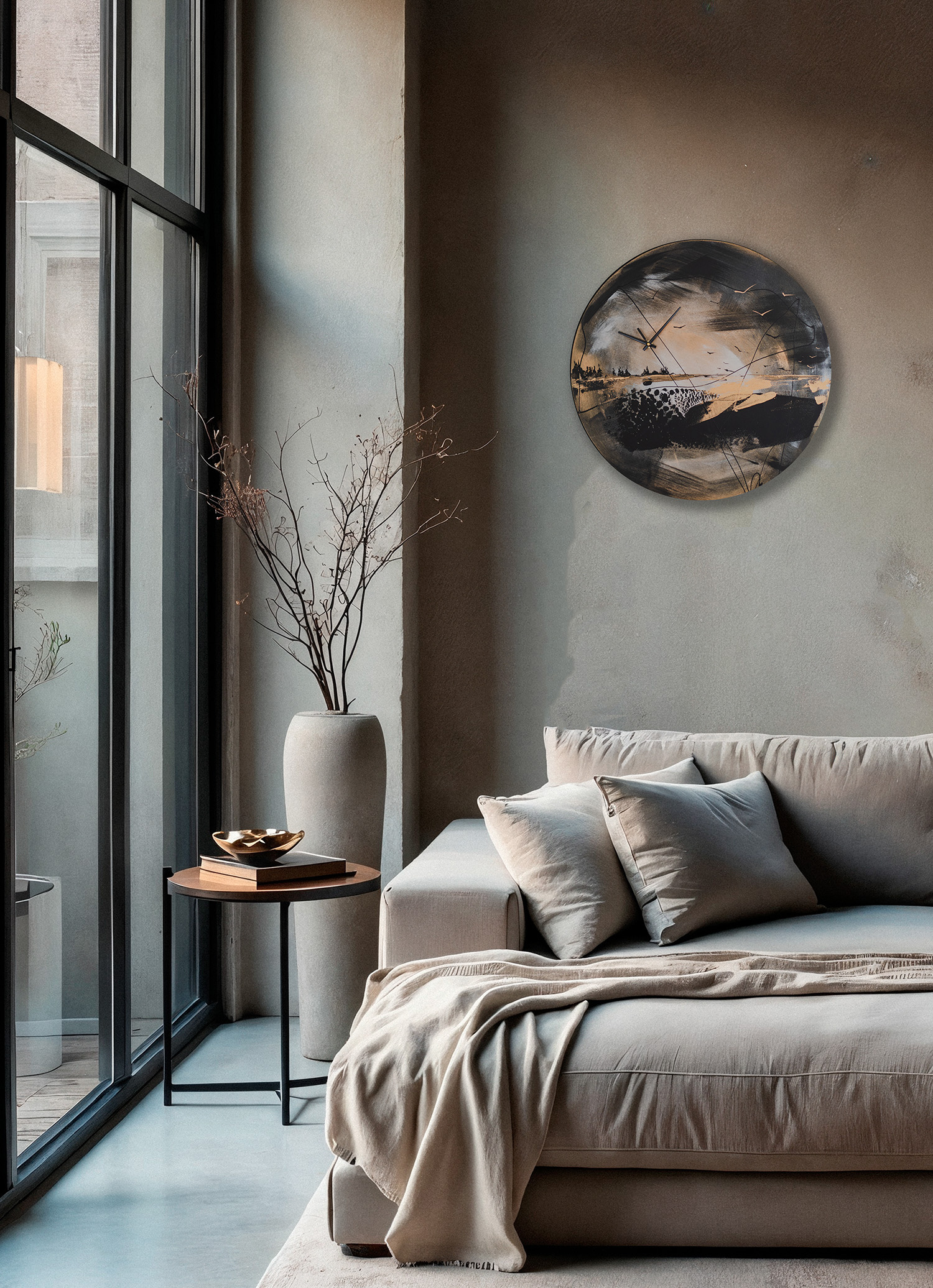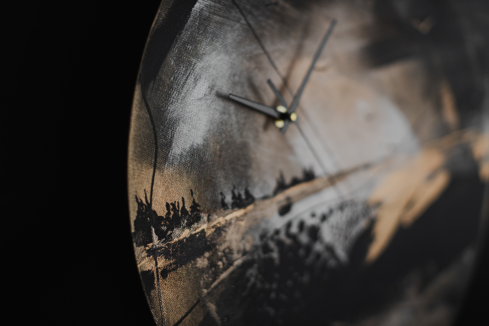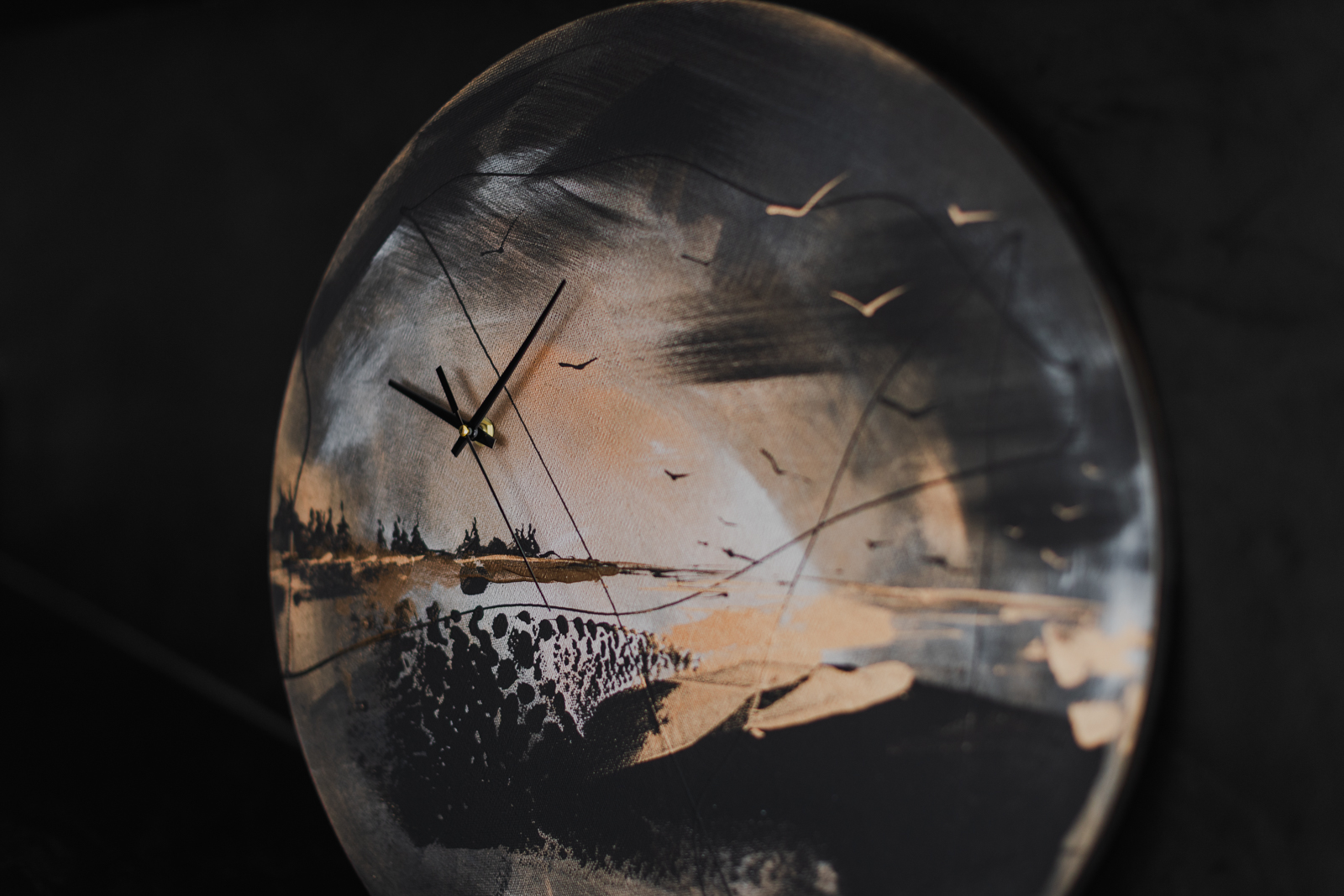 Dizaina pulkstenis “Tālumā” ir oriģināls interjera mākslas darbs – vairāk nekā dekors, tas ir noskaņas radītājs telpā. Modernisma stilā veidotā kompozīcija ar smalku mirdzumu piešķir virsmai dziļumu un dzīvīgumu. Mainoties apgaismojumam, darbs atklājas no jauna – brīžiem noslēpumains un klusināts, brīžiem maigi starojošs un gaismas piepildīts. Akcents, kas ienes telpā dabas brīvību un mūsdienu eleganci. Pulksteņa rādītāji papildina gleznu ar vieglu kustību un dinamisku noskaņu. Iederēsies gan klasiskā gan modernā interjerā.
