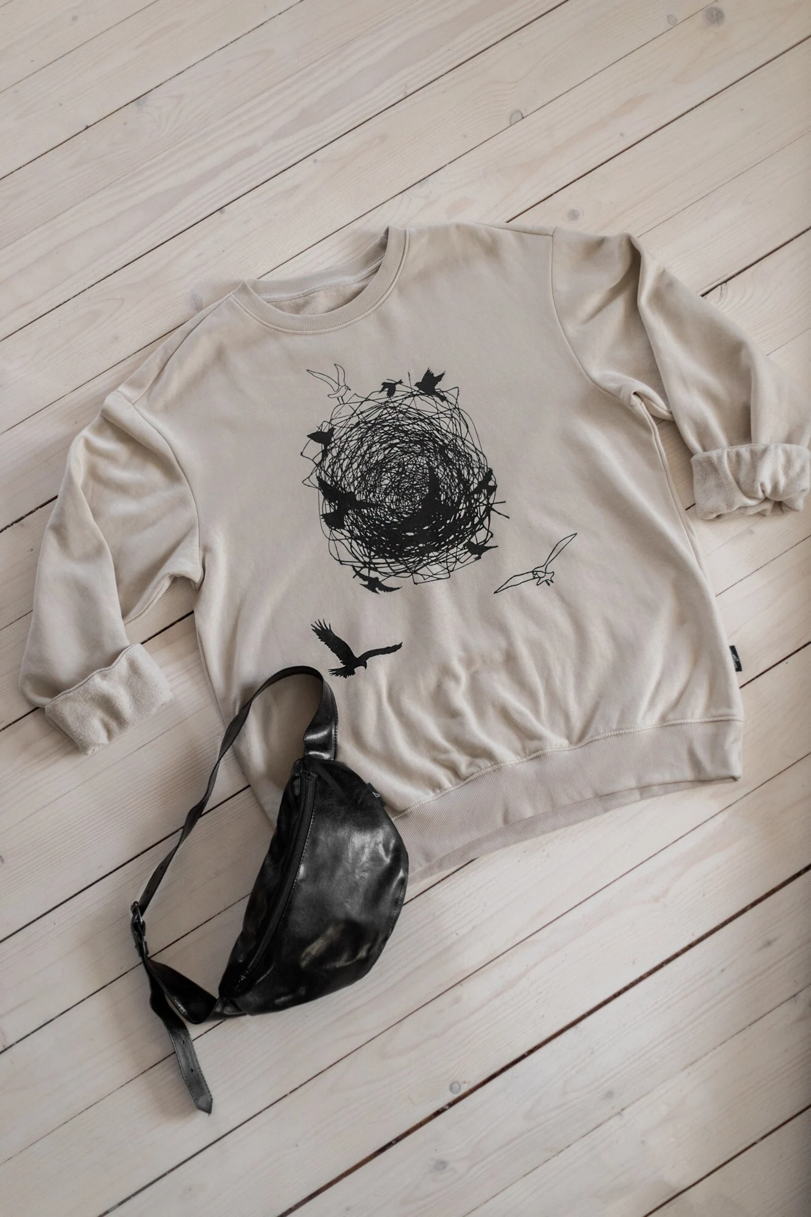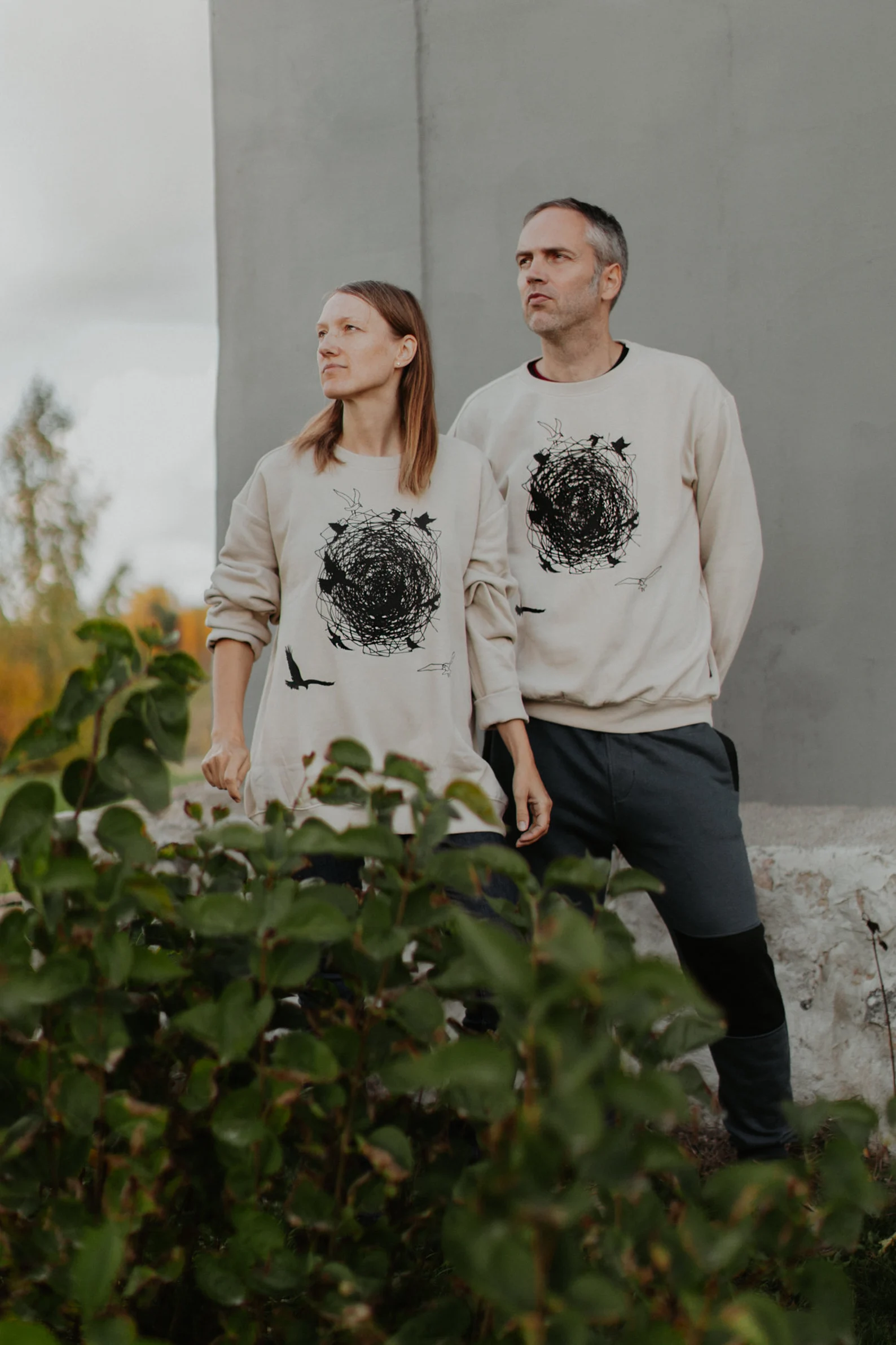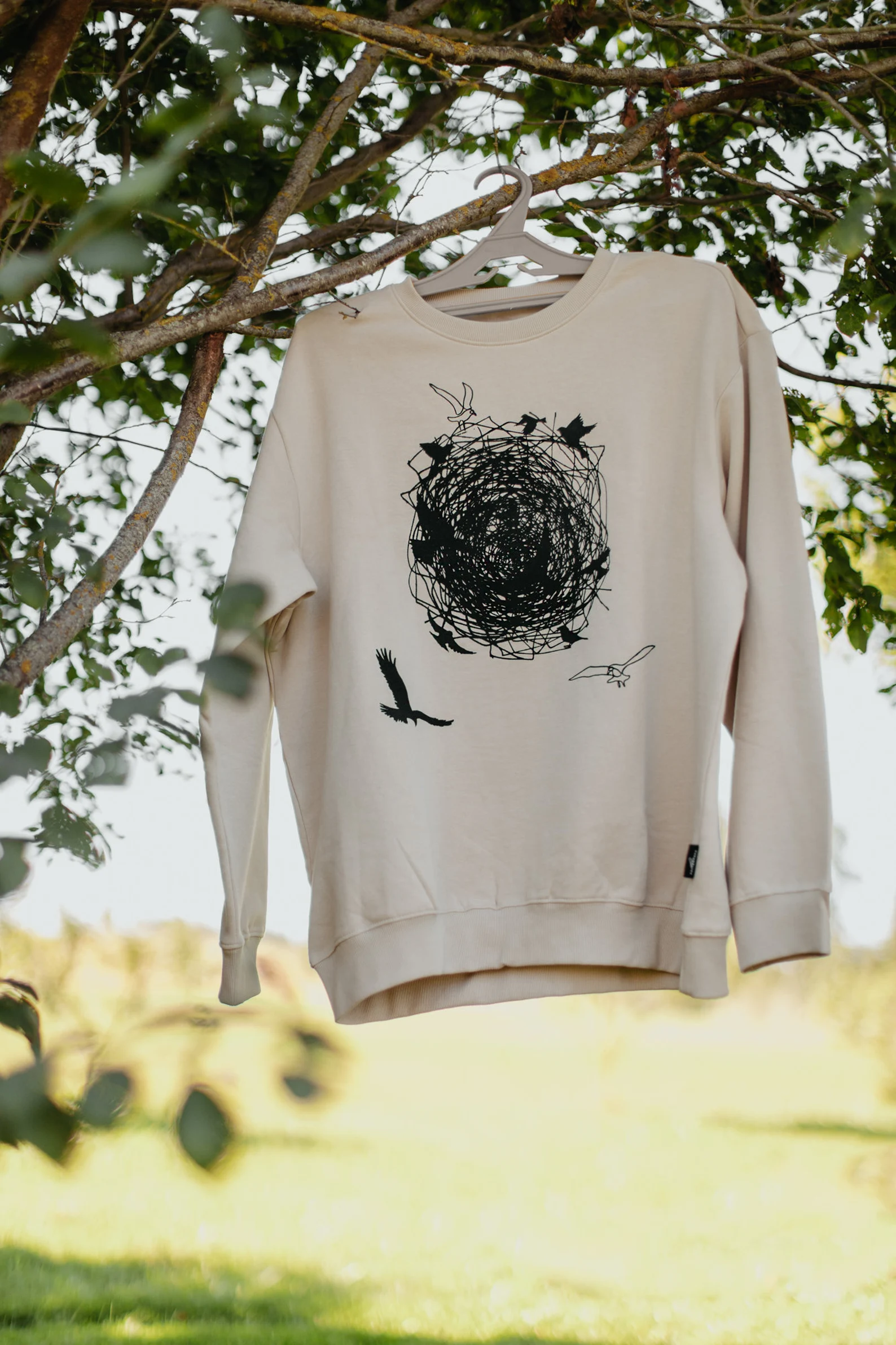 Džemperis “Putni” gaiši bēšā tonī apvieno komfortu, dabiskumu un brīvības sajūtu. Izgatavots no 57% kokvilnas un 43% poliestera, ar melnu sietspiedes apdruku, kas attēlo putnus.