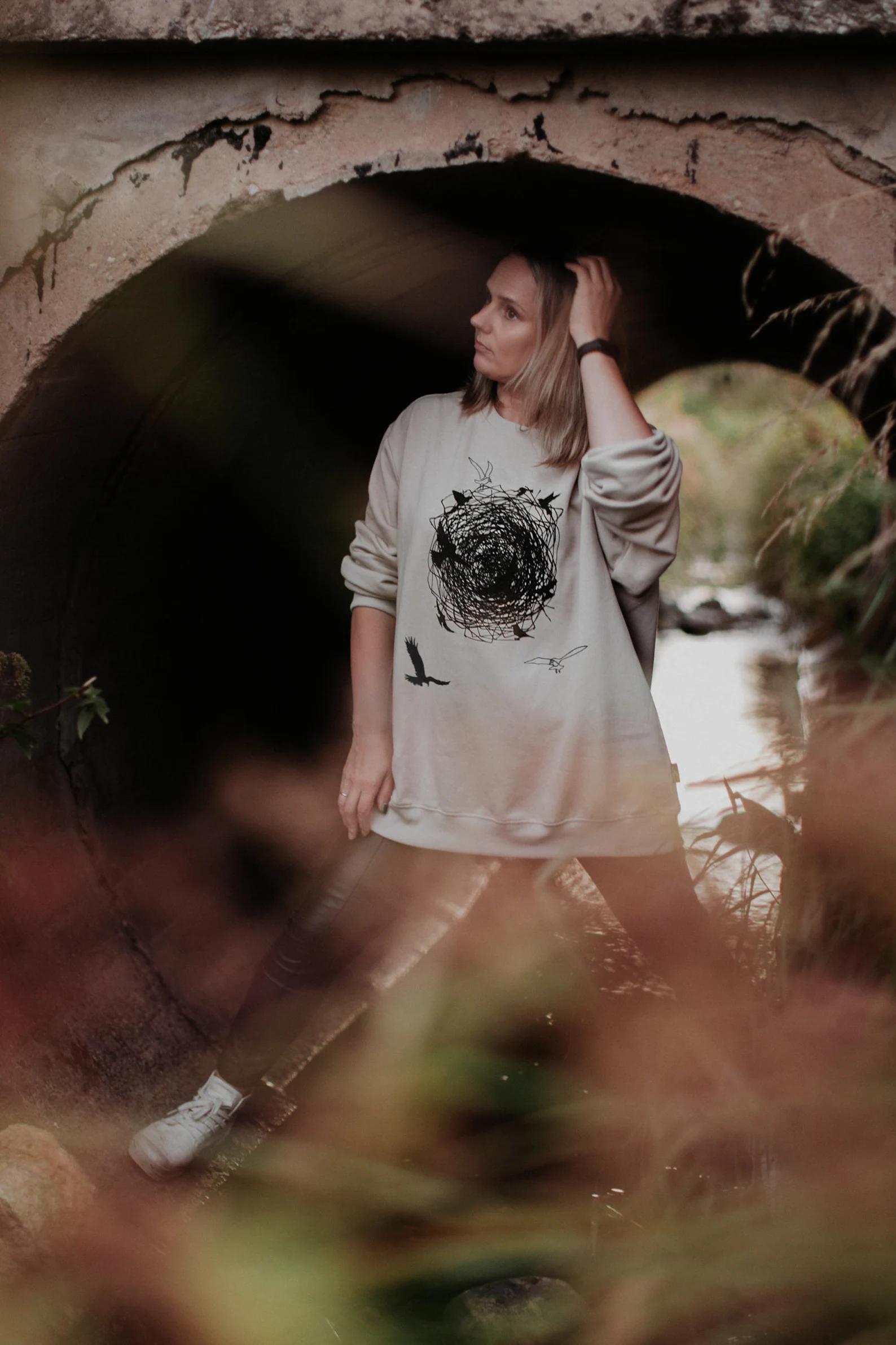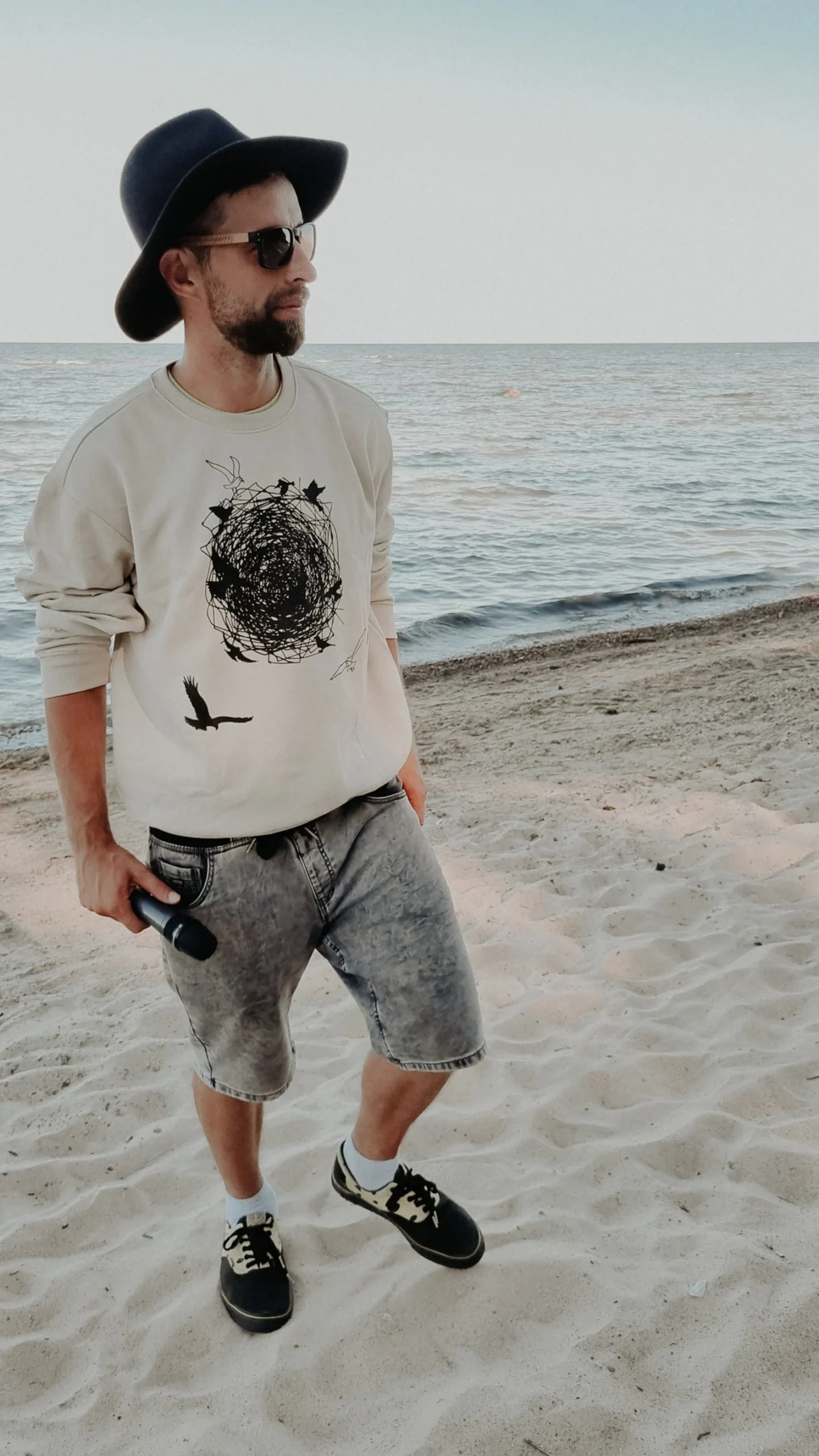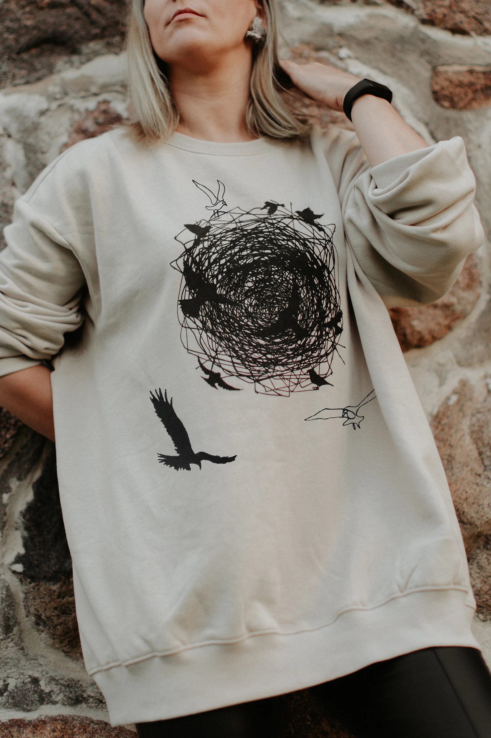 Džemperis “Putni” gaiši bēšā tonī apvieno komfortu, dabiskumu un brīvības sajūtu. Izgatavots no 57% kokvilnas un 43% poliestera, ar melnu sietspiedes apdruku, kas attēlo putnus.