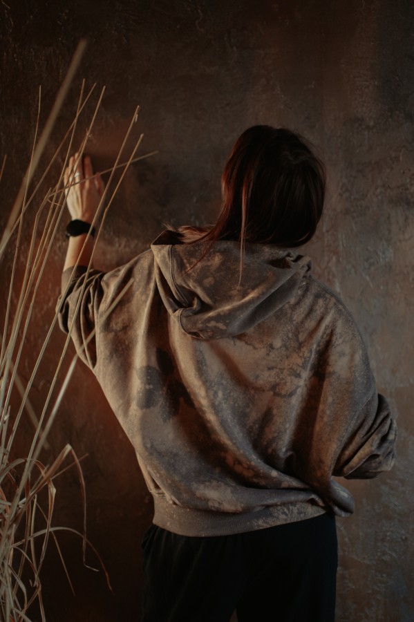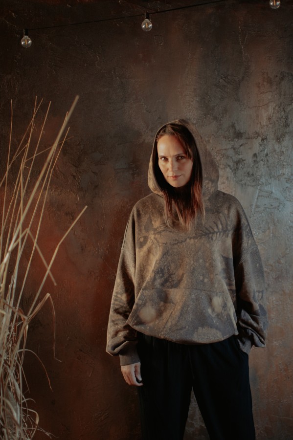 Attēlā redzama M izmēra modele, ar L izmēra džemperi.