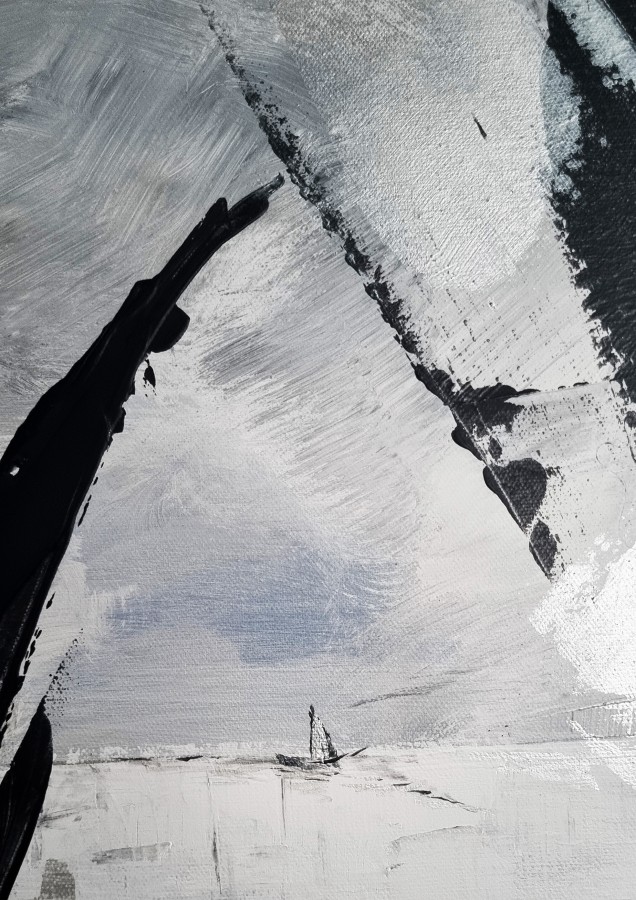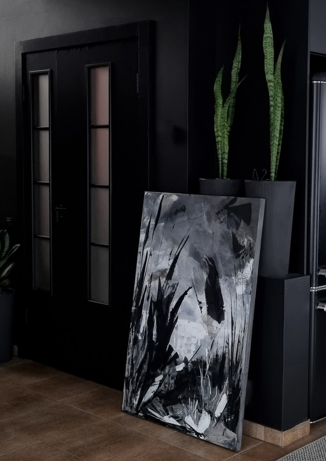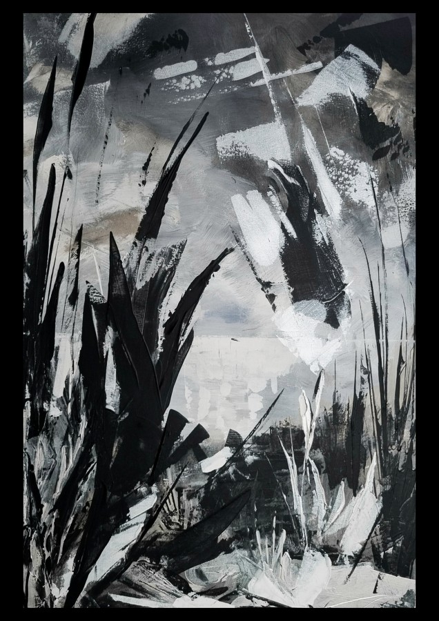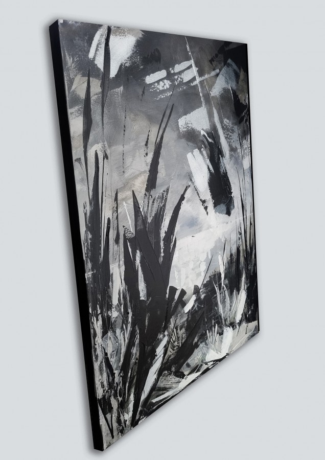 Darbs veidots jauktā tehnikā uz audekla, un tam piemīt mirdzuma efekts, kas mainās līdz ar apgaismojumu, piešķirot telpai dzīvīgumu un dziļumu. Lieliski piemērota plašām un gaisīgām telpām, kur nepieciešams akcentēt mieru un kustību vienlaikus.