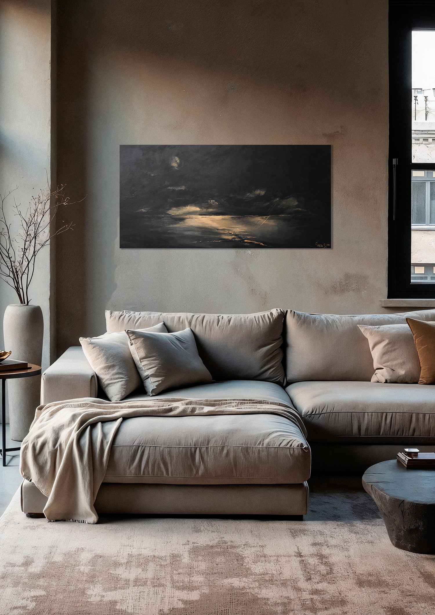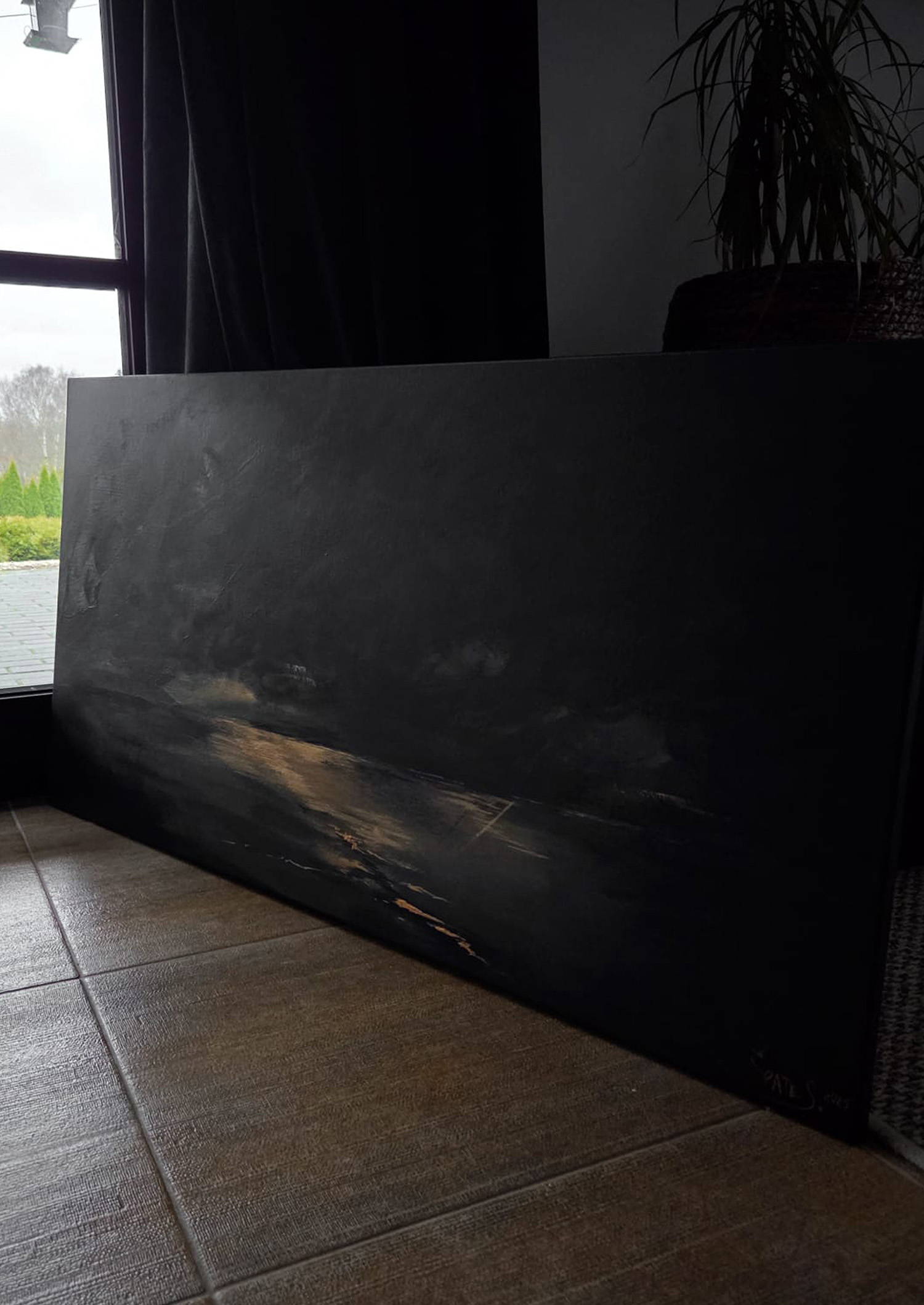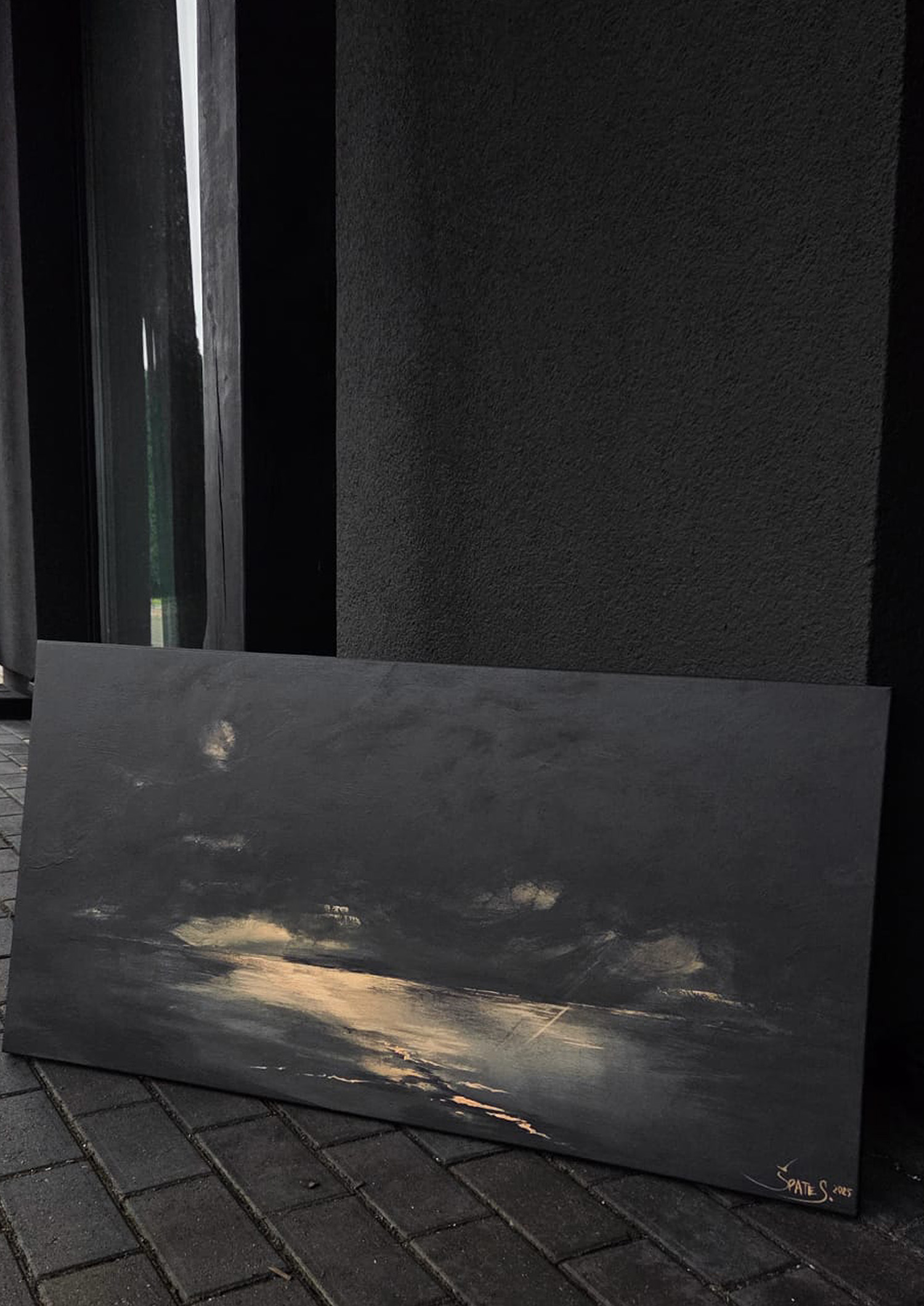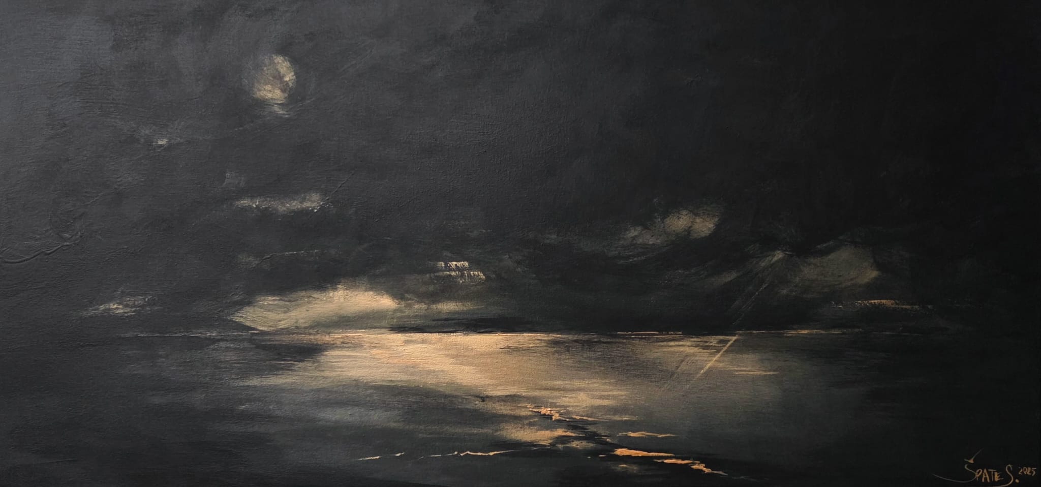 Mēness gaisma ūdens virsmā iezīmē klusu pāreju starp ārējo pasauli un iekšējo mieru. Tumšie, dziļie toņi kontrastē ar trauslo gaismu, radot sajūtu par cerību, kas pastāv pat visklusākajā tumsā.