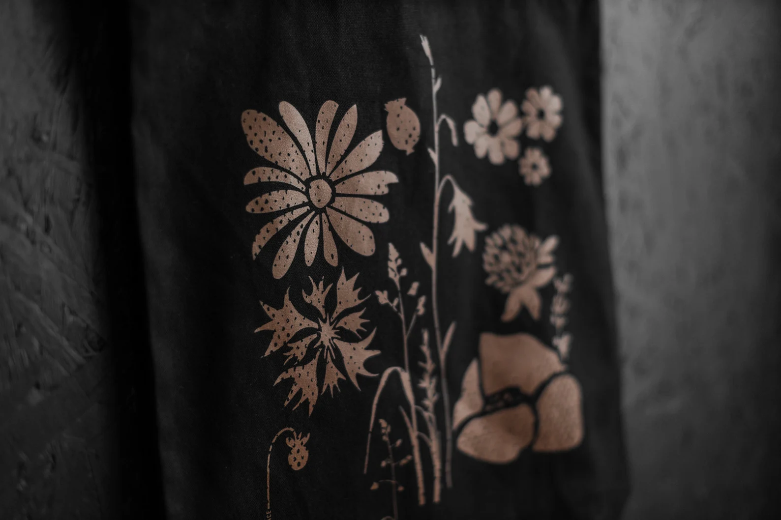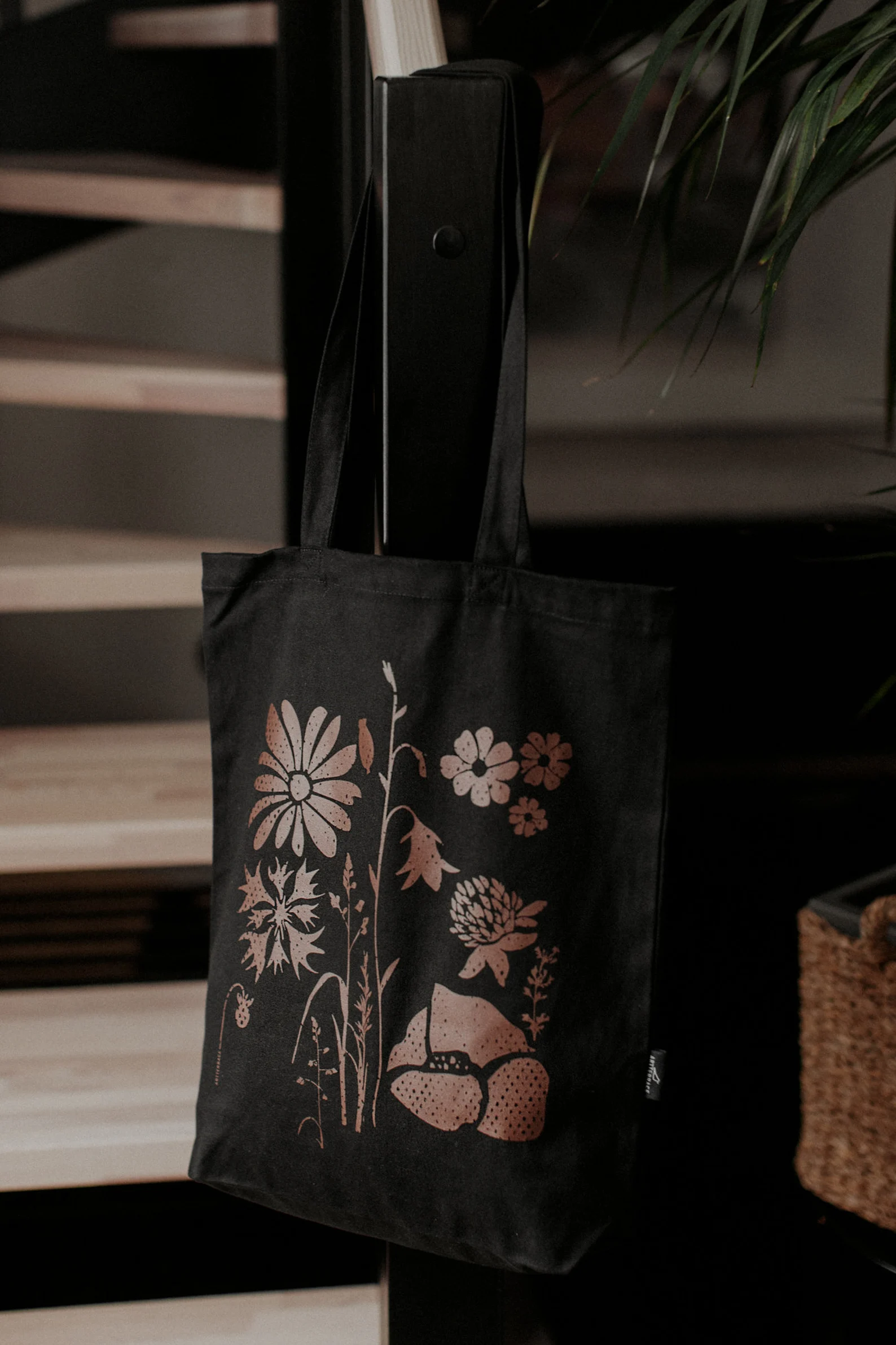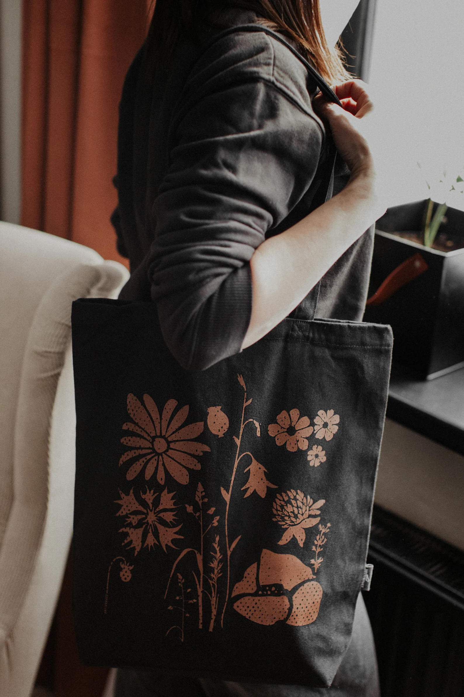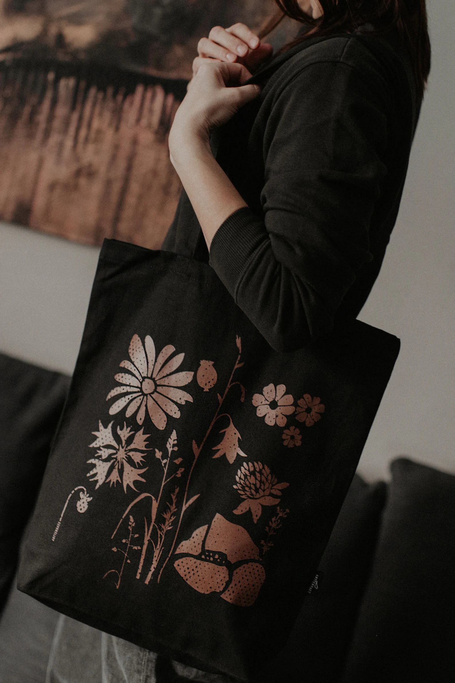 Iepirkumu soma radīta no kokvilnas (auduma blīvums 270g/m2), tā nodrošina izturību. Sietspiedes tehnikā radītais zīmējums piešķir īpašu mirdzumu, kas maina toņu nianses atkarībā no apgaismojuma.