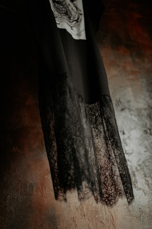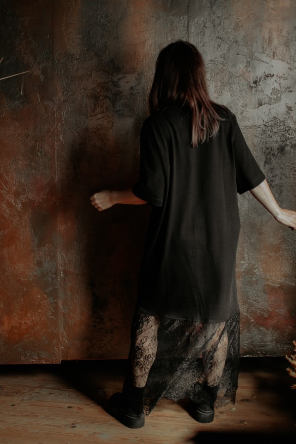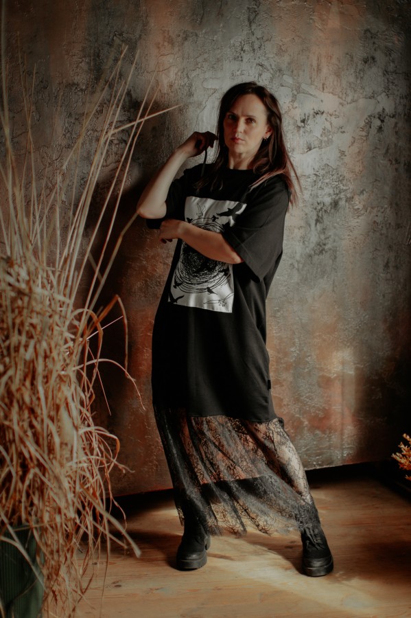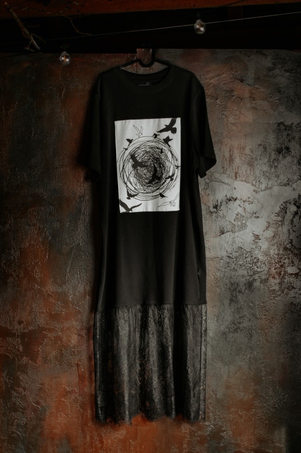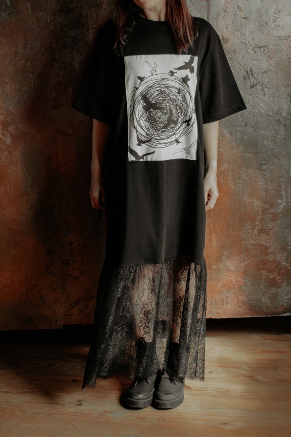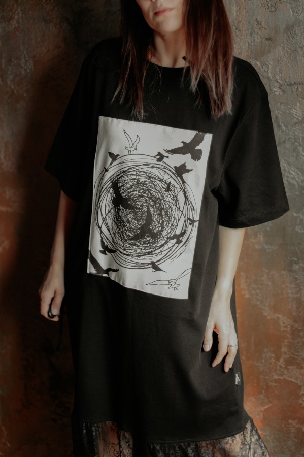 Kleita “Putni” ar melno mežģīni apvieno ērtību un eleganci. Melnbaltā T-krekla stila kleita rotāta ar sietspiedes tehnikā apdrukātu aplikāciju un melnu mežģīni.
