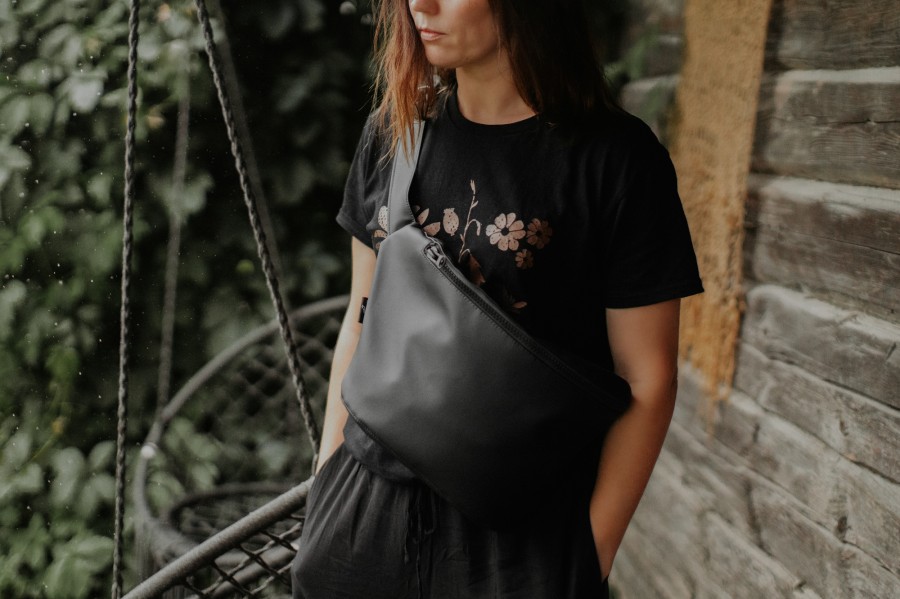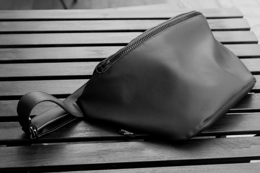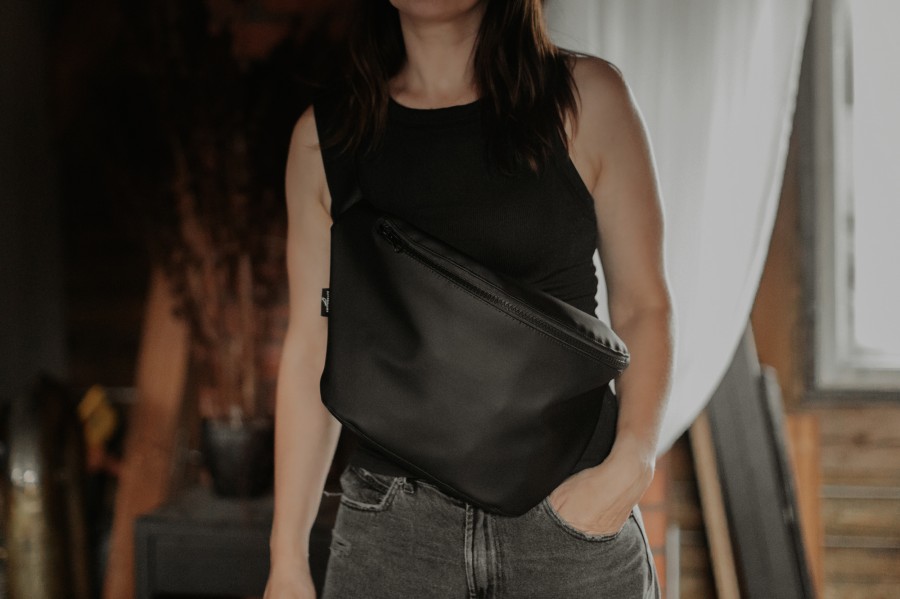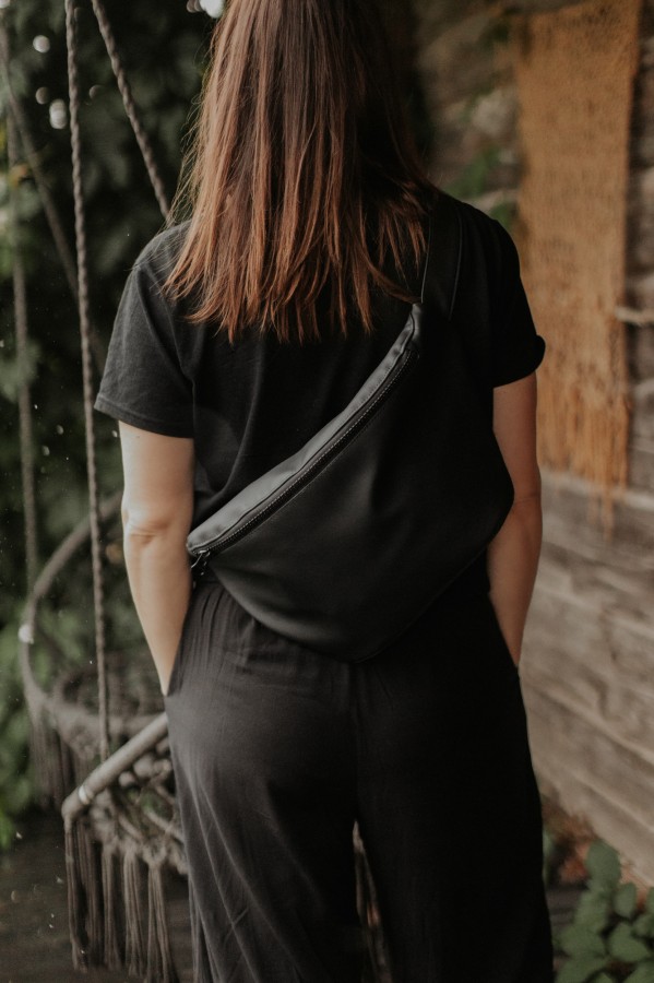 Melnā lielā jostassoma ir moderna un ērta. Tā ir izgatavota no mākslīgās ādas ar melnu poliestera oderi, izturīga un viegli kopjama.