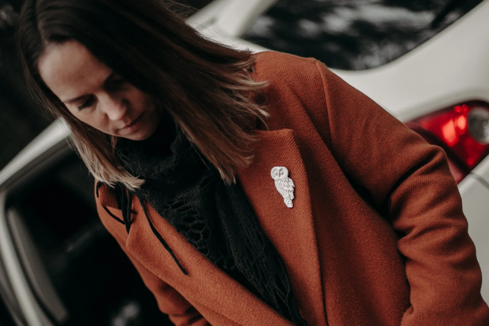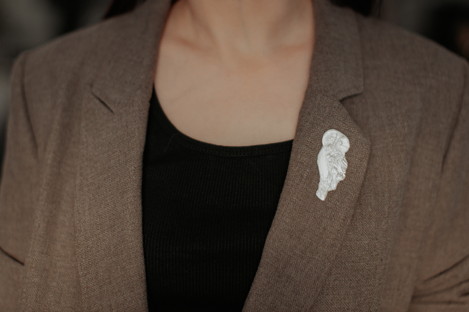 Piespraude “Baltā pūce”, gudrības un noslēpumainības simbols, kas piešķir aksesuāram īpašu raksturu. Eleganti baltais tonis kā papildinājums gan ikdienas, gan svētku tērpiem.