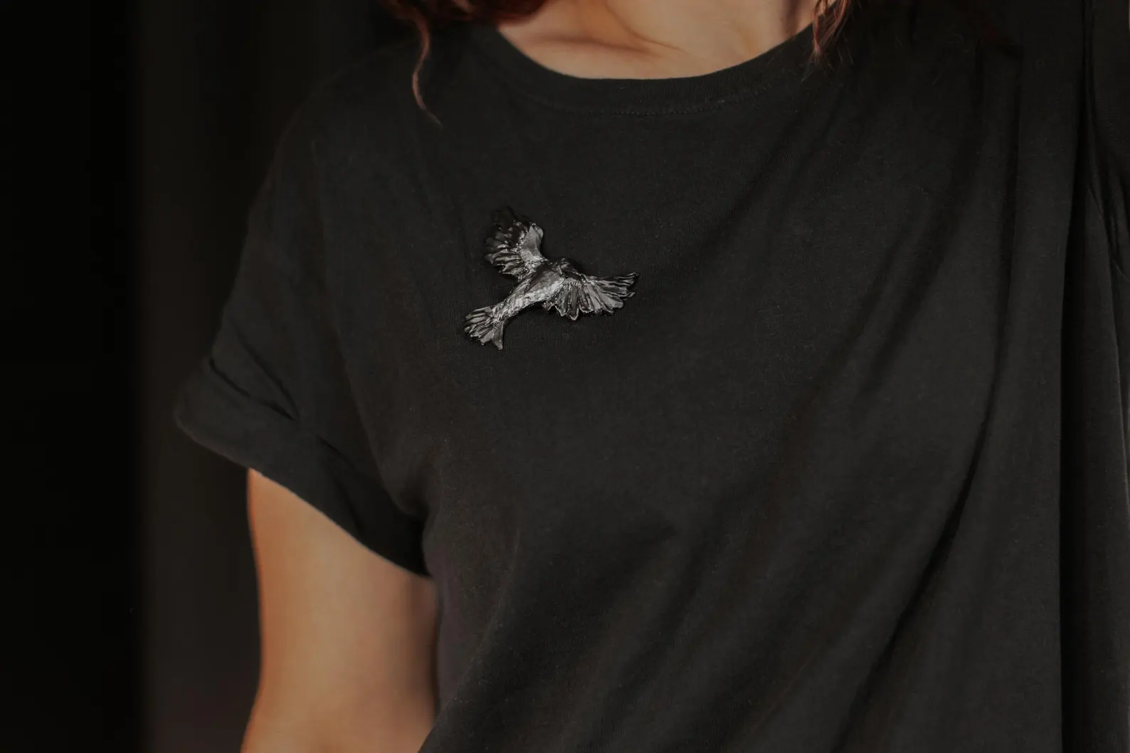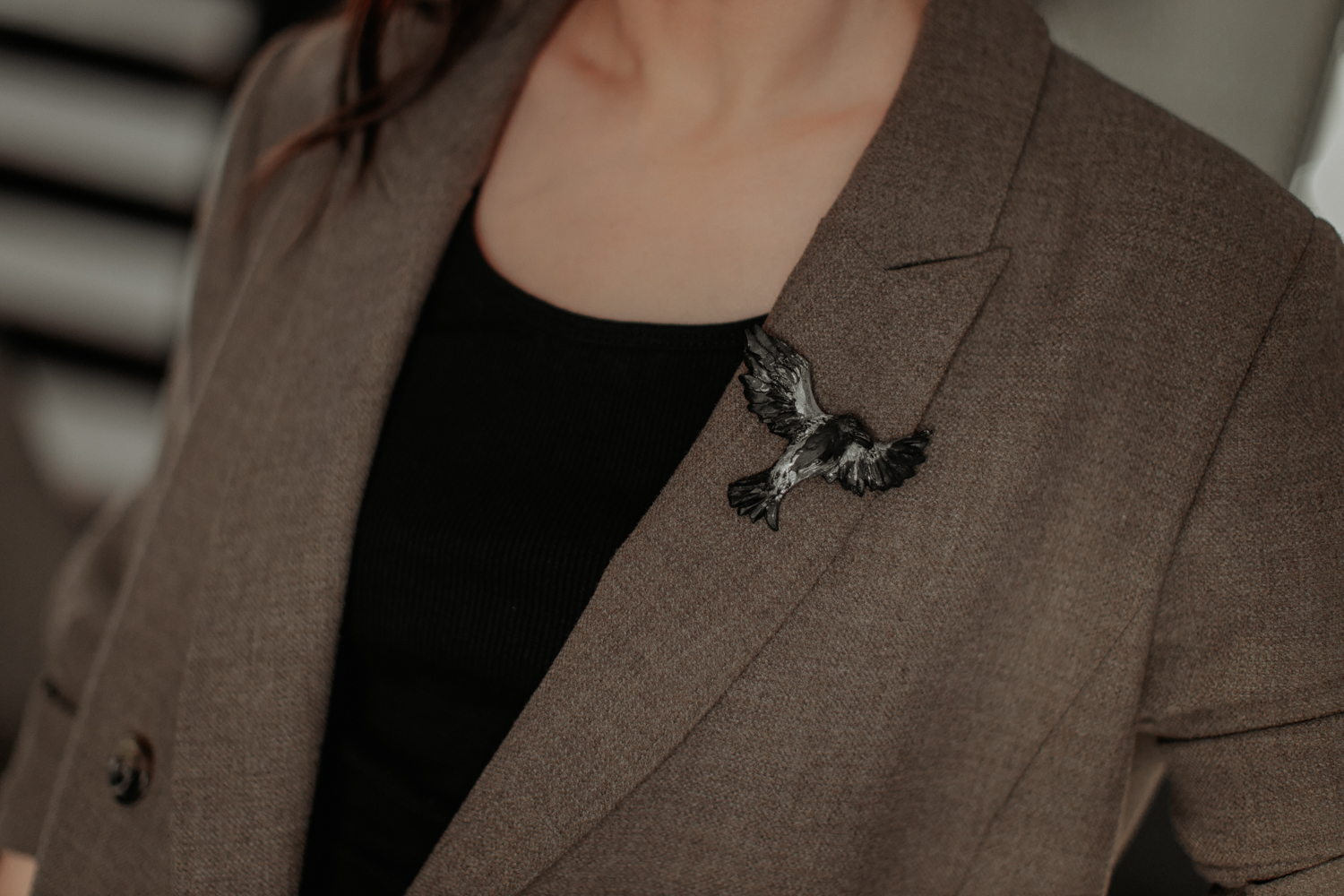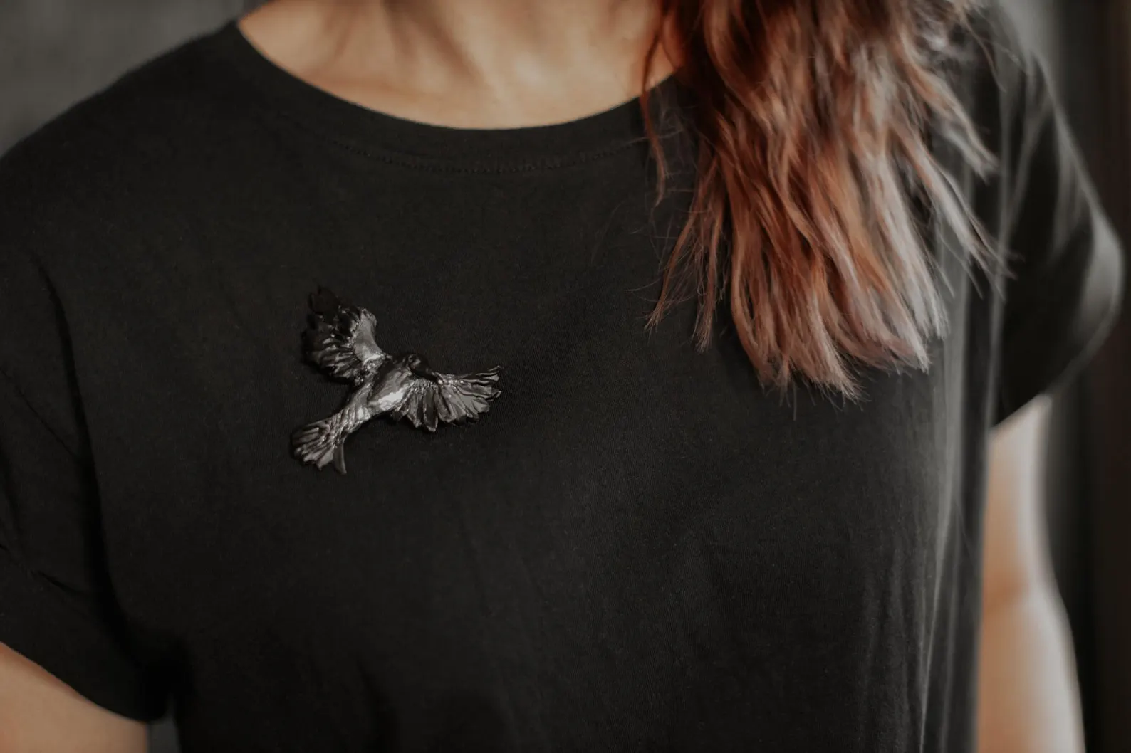 Piespraude “Vārna” ir drosmīgs un izteiksmīgs aksesuārs, kas rada brīvības un noslēpumainības sajūtu. Izgatavota no polimērmāla un apglezaota ar akrila krāsu.