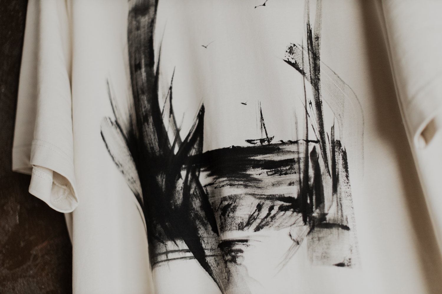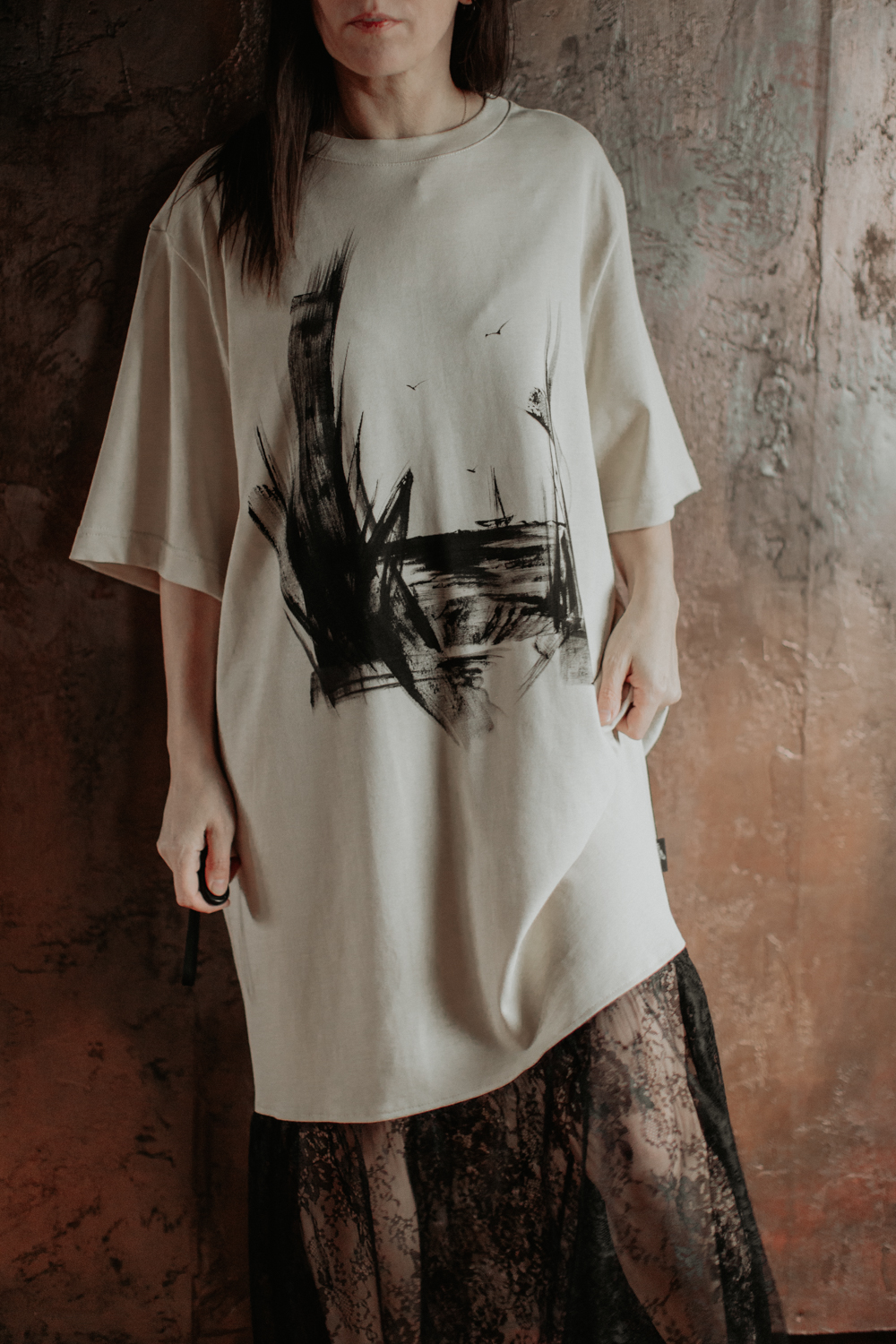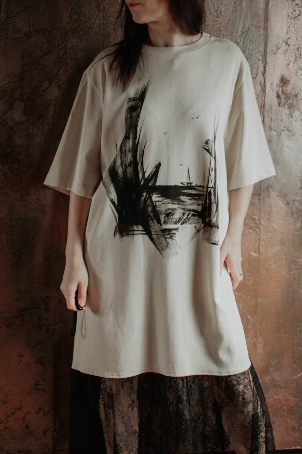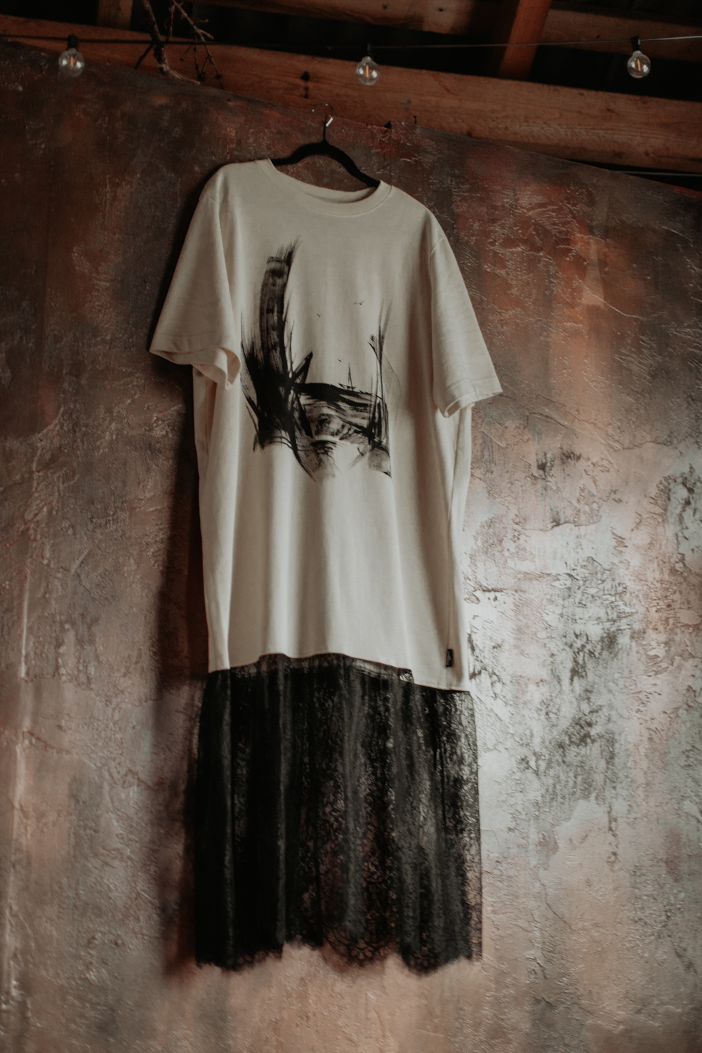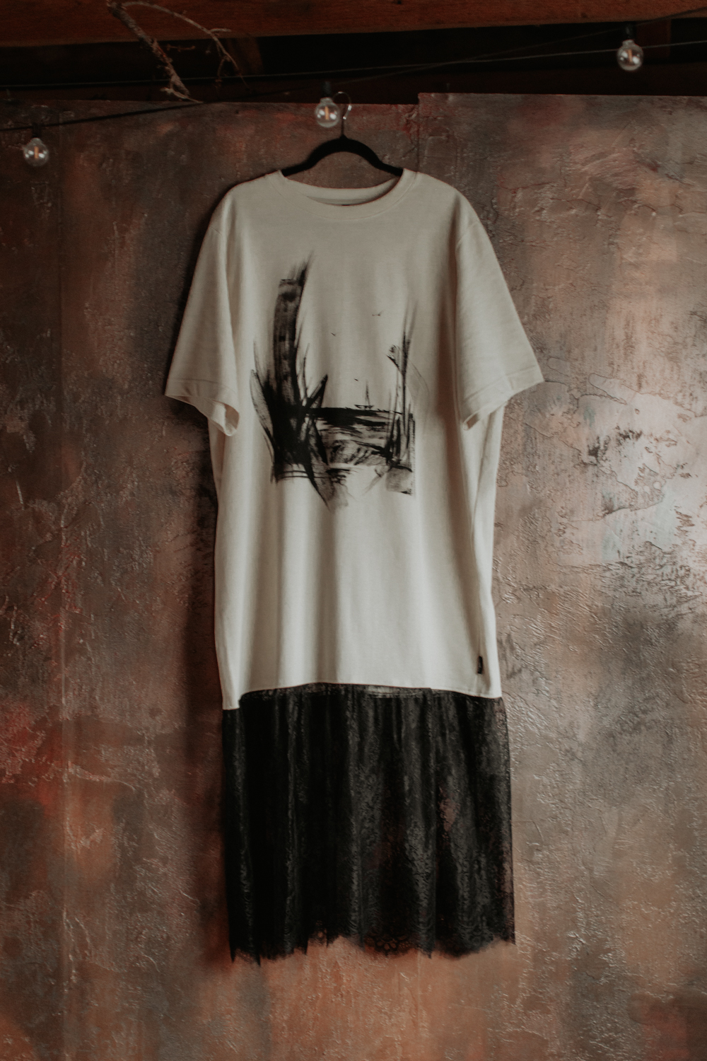T-krekla kleita ar UNIKĀLU gleznu un melnu mežģīni. Kleita apvieno ērtību un eleganci. Melnbaltā T-krekla stila kleita rotāta ar gleznojumu tieši uz kleitas, papildināta ar melnu mežģīni. Izgatavota no bieza kokvilnas džersija un mežģīnes, kleita ir komfortabla, piemērota gan ikdienas valkāšanai gan svinīgiem pasākumiem.