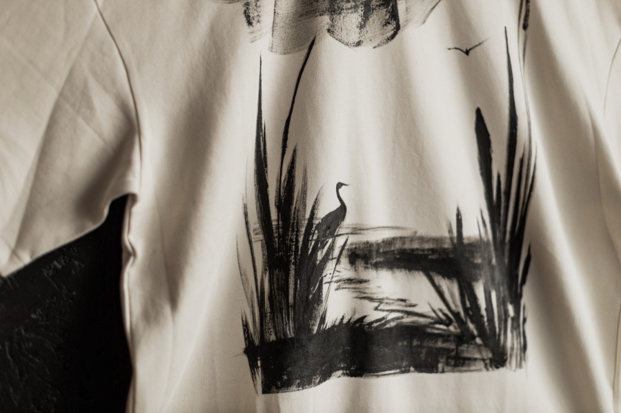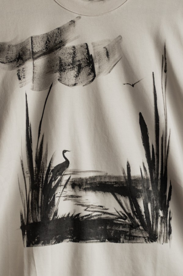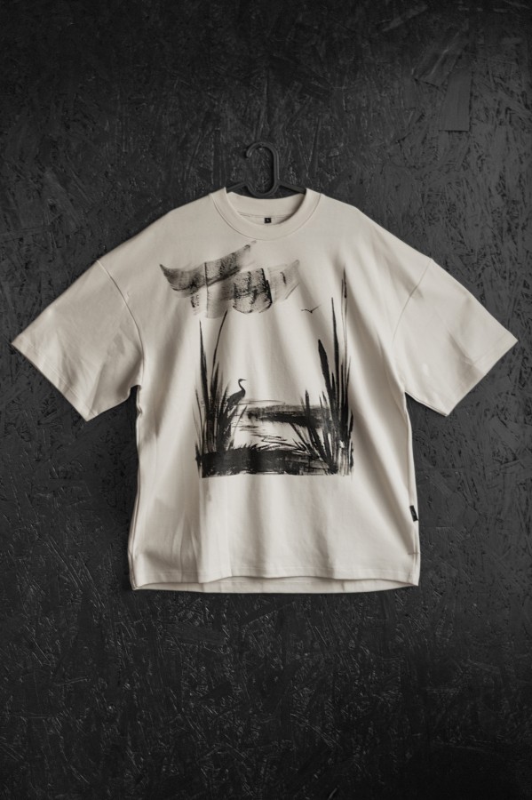 Bēšs oversize T-krekls ar gleznojumu, vienā eksemplārā, izmērā un dizainā, jo gleznots tieši uz krekla.