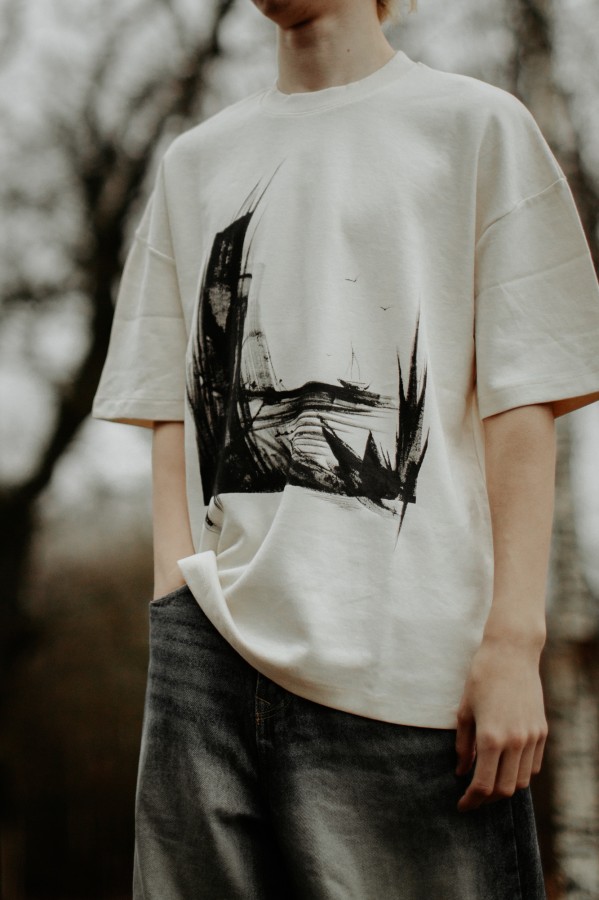 Bēšs oversize T-krekls ar gleznojumu, vienā eksemplārā, izmērā un dizainā, jo gleznots tieši uz krekla.