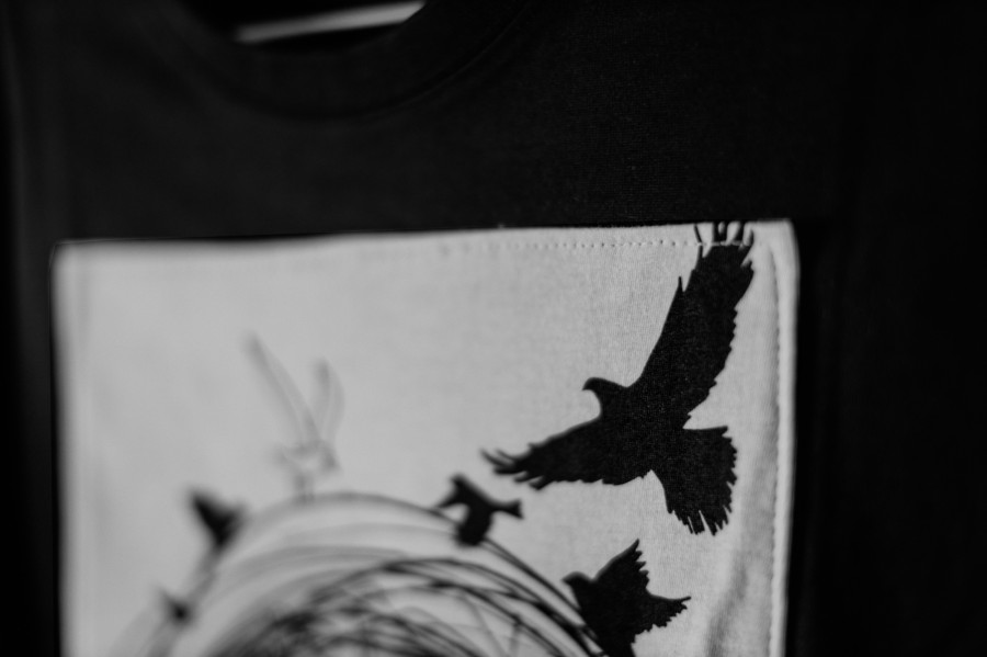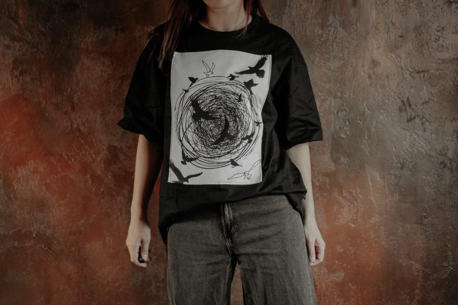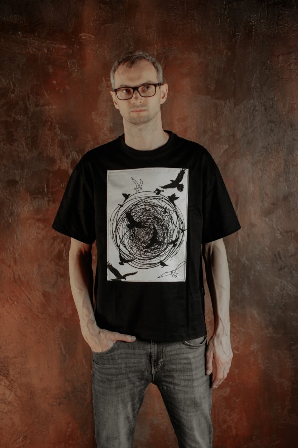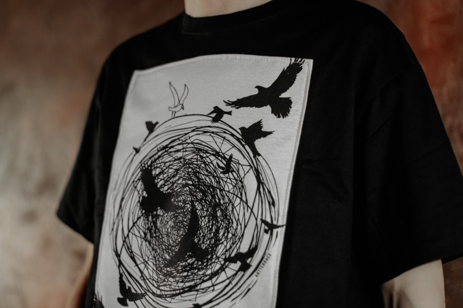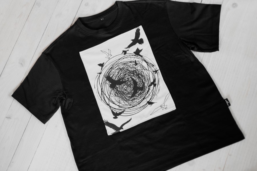 T-krekls “Putni” ar sietspiedē apdrukātu un uzšūtu aplikāciju simbolizē brīvību un mājas sajūtu — putni kā brīvības tēls, ligzda kā miers un piederība.